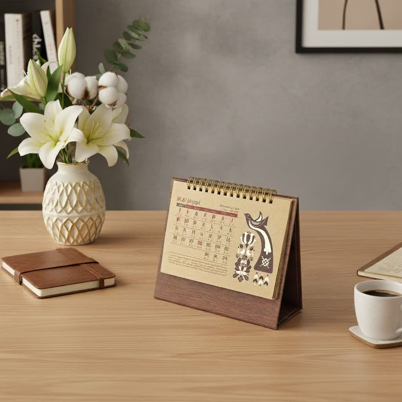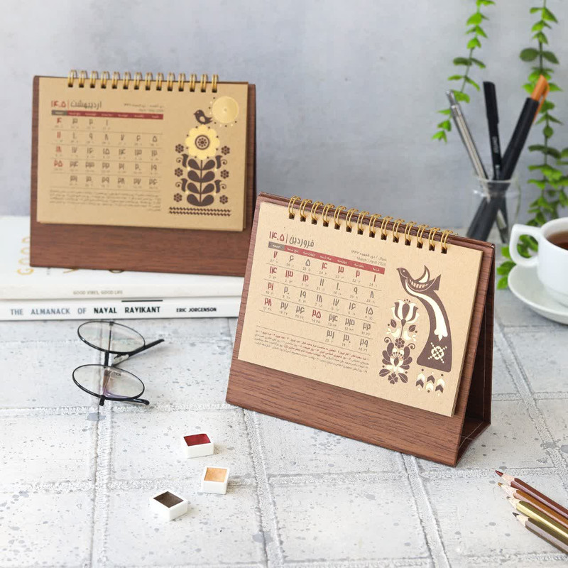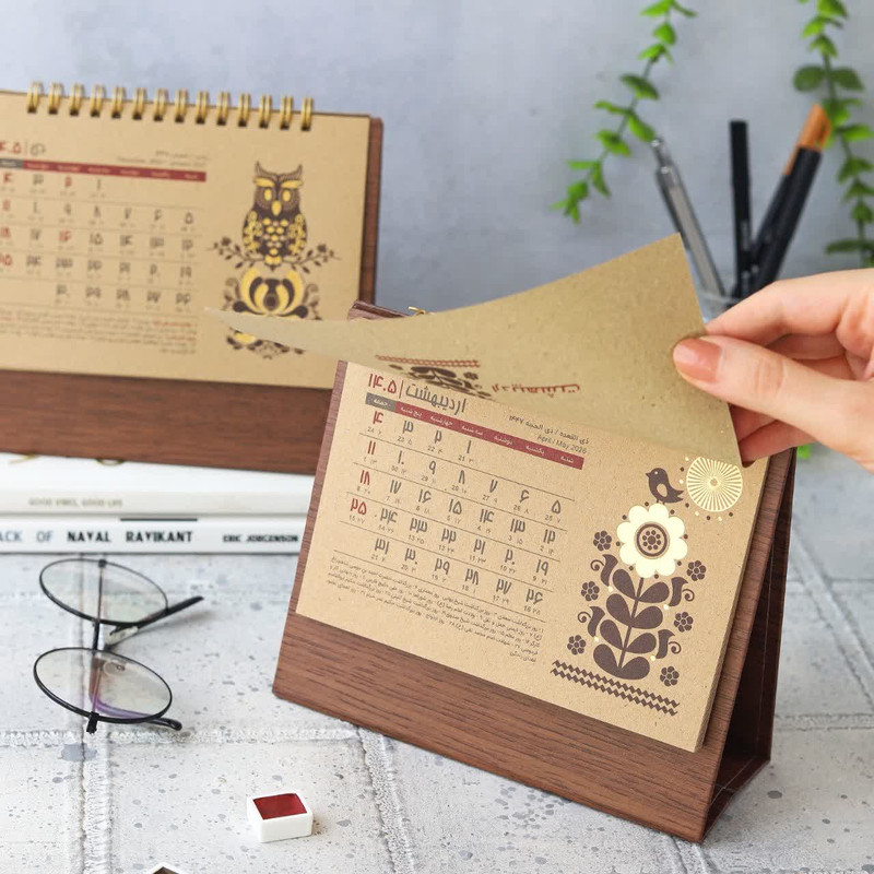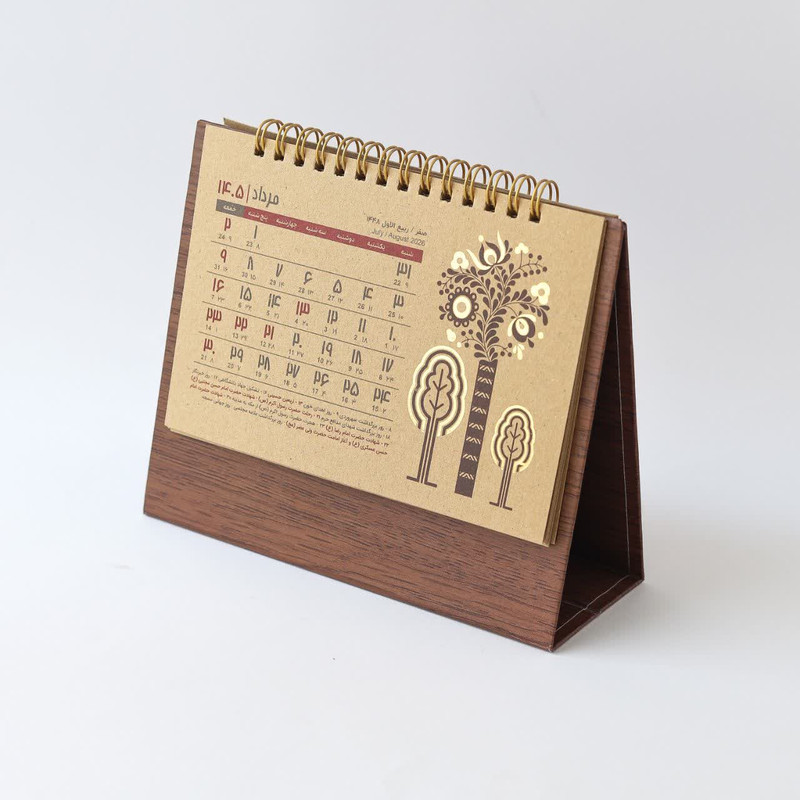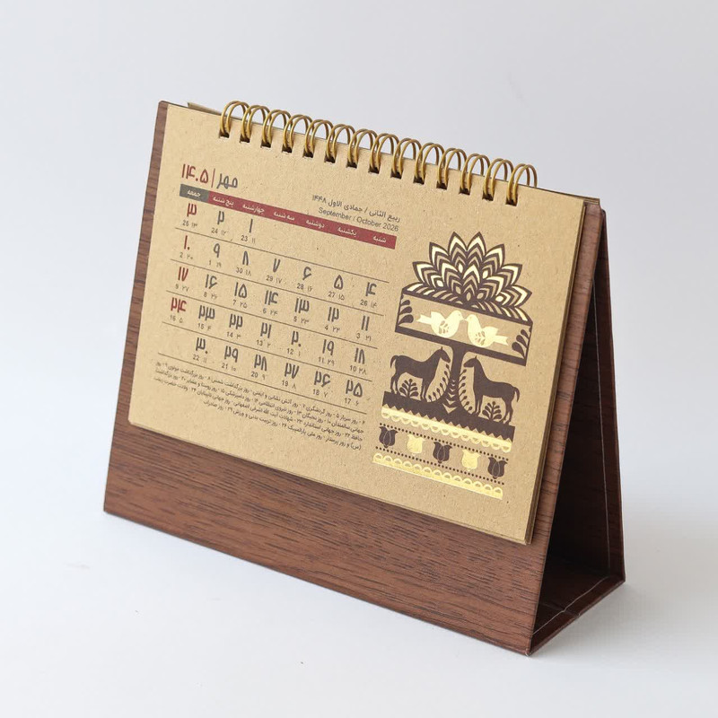 تقویم رومیزی طلاکوب دایان، یکی از محصولات خاص و متمایز این برند است. مقوای کرافت استفاده شده، تصاویر انتزاعی جذاب و ترکیب آنها با طلاکوبی خیره کننده و پایه ای محکم با طرح چوب، زیبایی کم نظیری به میز شما میدهد. در عین حال جذابیتهای این محصول باعث میشود، انتخابی ایده آل به عنوان هدیه باشد. همچنین با توجه به فضای مناسب بر روی پایه این تقویم و امکان طلاکوب لوگو و اطلاعات شرکتها، هدیه تبلیغاتی کم نظیری نیز به شمار میرود. این تقویم به صورت ماه شمار و دارای سالهای شمسی، میلادی، قمری میباشد.