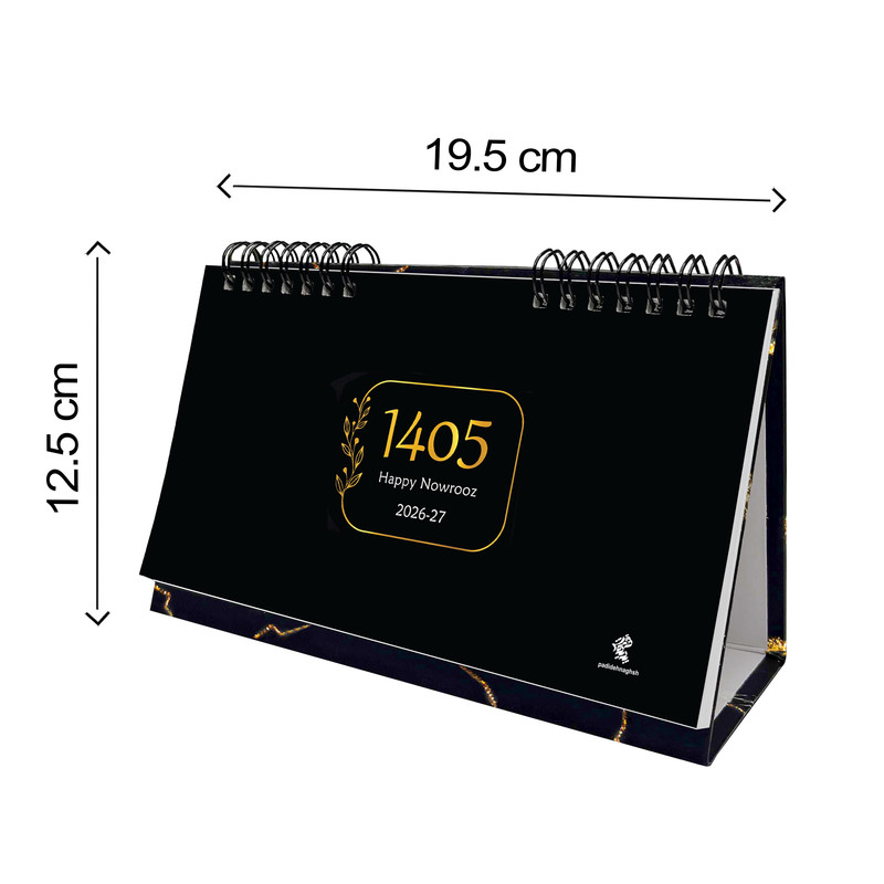 ابعاد تقویم همراه با پایه 19.5 * 12.5 سانتیمتر است و برگههای داخلی در اندازه 19.5* ۱۱ سانتیمتر طراحی شدهاند؛ فضایی استاندارد و خوانا که بدون اشغال زیادِ سطح میز، نمایش تقویم را کاملاً واضح نگه میدارد. صفحهی نخست با زمینهی مشکی و طراحی طلایی جلوهای خاص دارد، اما صفحات داخلی به رنگ سفید هستند تا خوانایی بیشتر و ظاهر هماهنگتری ایجاد شود. این صفحات با ترکیب رنگ طوسی و طلایی طراحی شدهاند که هویت بصری تقویم را یکدست و لوکس جلوه میدهد.