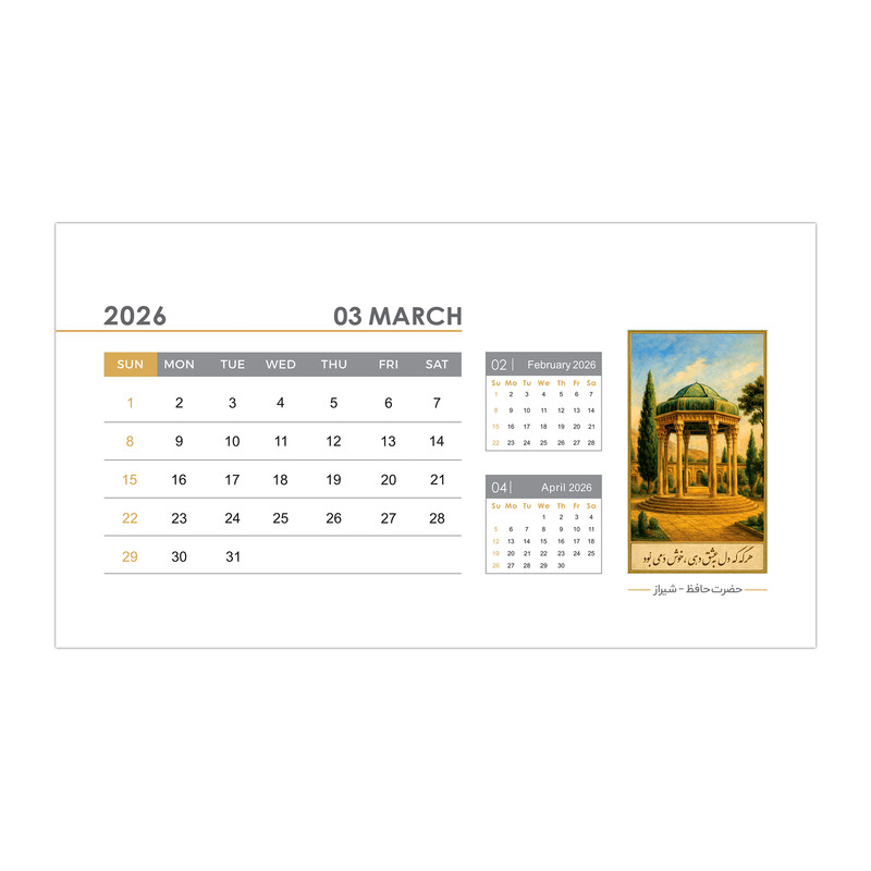 در هر ماه، تصویری از آرامگاه یکی از شاعران ایرانی همراه با یک مصرع از آثار همان شاعر قرار گرفته است؛ جزئیاتی که به تقویم حالوهوایی فرهنگی میبخشد و آن را فراتر از یک ابزار سادهی برنامهریزی قرار میدهد.