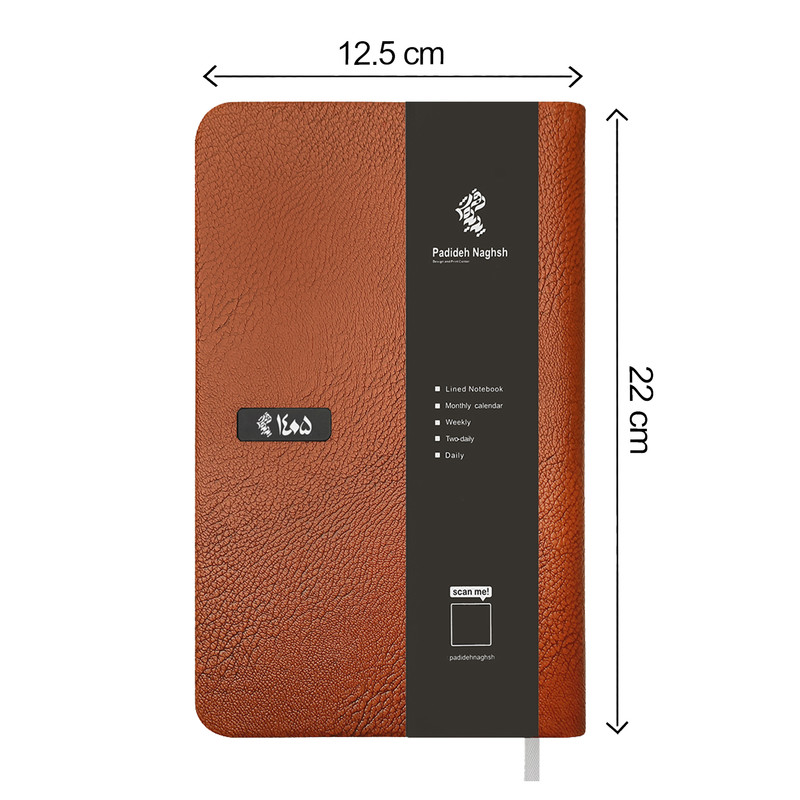 جلد سخت این محصول از چرم جونیور ساخته شده؛ چرمی با بافت منظم و مقاوم که حس کیفیت را از همان اولین لمس منتقل میکند. این مدل در رنگ عسلی ارائه میشود و پلاک مشکی درجشده با عدد ۱۴۰۵ روی جلد، هویت سال را بهصورت شکیل و رسمی مشخص میکند. ابعاد سررسید ۲۲ در ۱۲.۵ سانتیمتر است که باعث میشود هم فضای نوشتاری کافی داشته باشد و هم حمل آن در کیف یا روی میز کار راحت باشد.