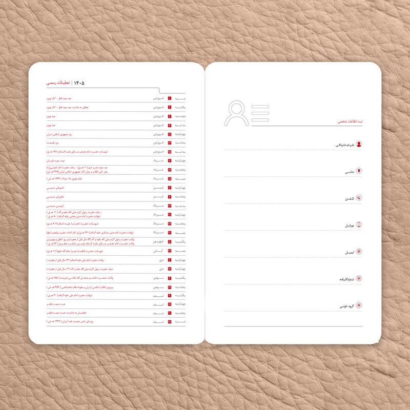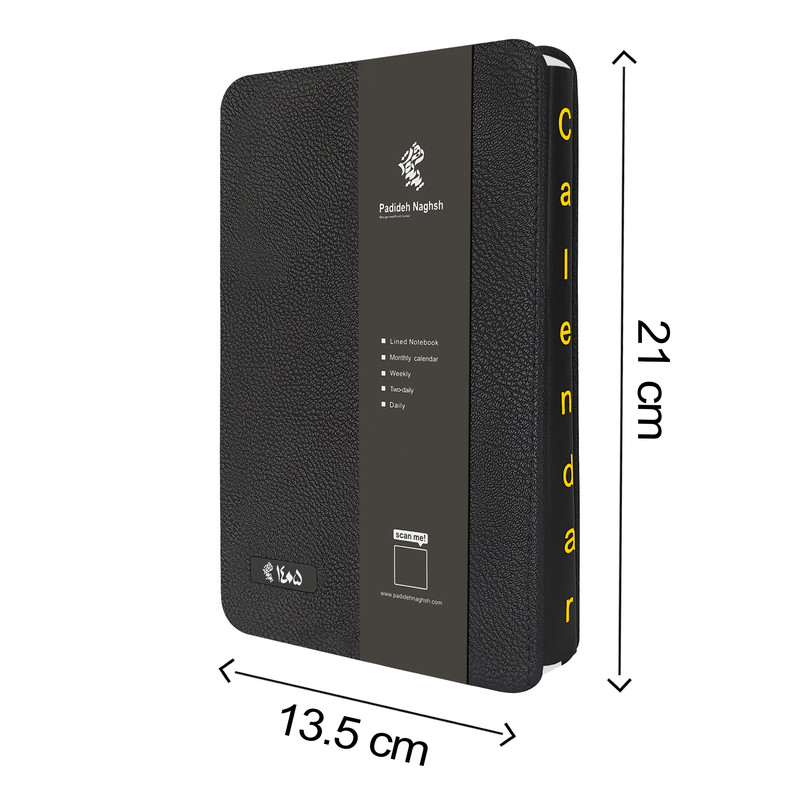 این مدل، یک ویژگی خاص در طراحی عطف دارد؛ دو رنگ زرد و قرمز روی لبه داخلی عطف قرار گرفته که علاوه بر جذابیت بصری، بهسرعت قابل شناسایی است. پلاک مشکی با نشانه ۱۴۰۵ نیز روی جلد نصب شده و ظاهر محصول را کاملتر میکند.