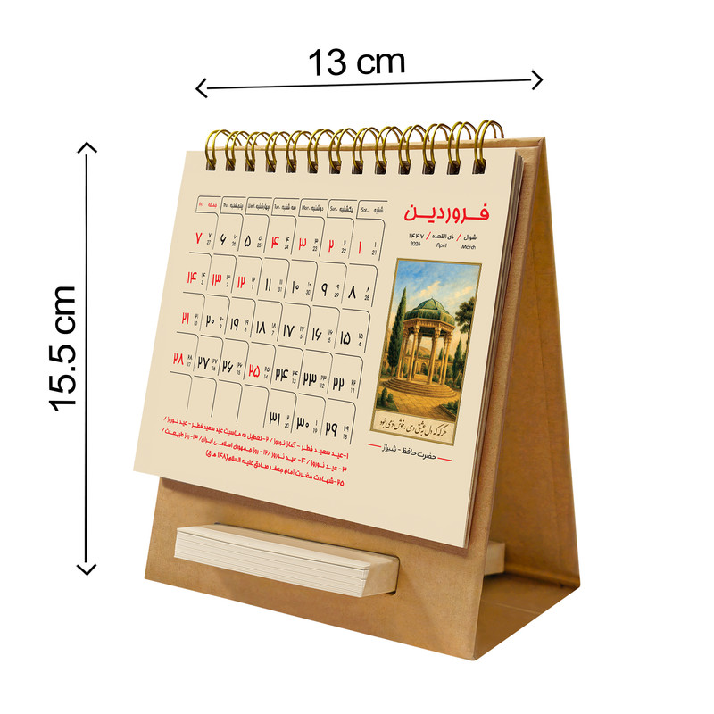 صفحات داخلی از جنس کاغذ گلاسه چاپ شدهاند و همین باعث میشود رنگها، نوشتهها و تصویرها شفاف و دقیق نمایش داده شوند. ابعاد تقویم با پایه ۱۳ در ۱۵/۵ سانتیمتر است و صفحات ۱۳ در ۱۱ سانتیمتر طراحی شدهاند؛ اندازهای که خوانایی را بالا نگه میدارد و در عین حال فضای کمی اشغال میکند. فنر دوبل طلایی در بالای تقویم، هم از نظر بصری هماهنگ با رنگ کرافت است و هم ورقزدن ماهها را روان و راحت میکند.