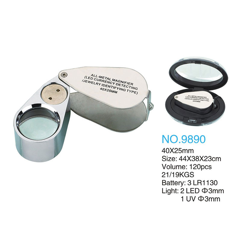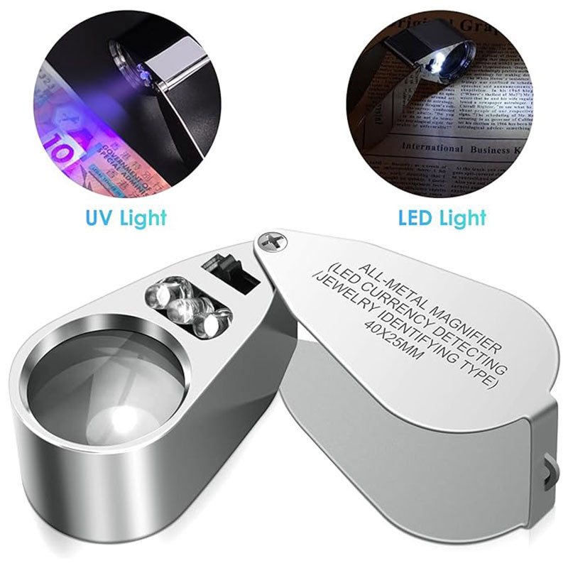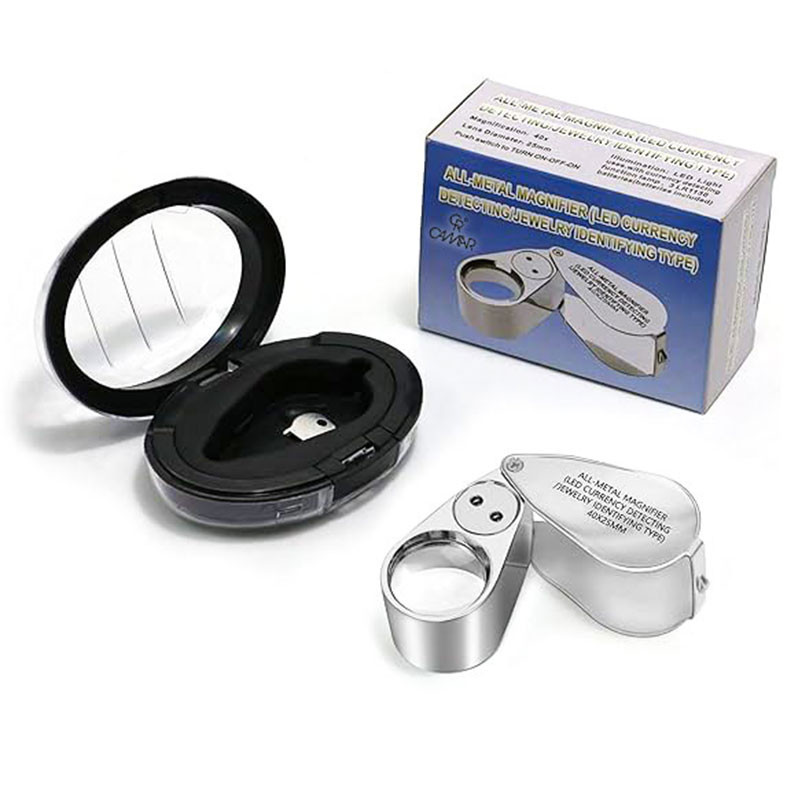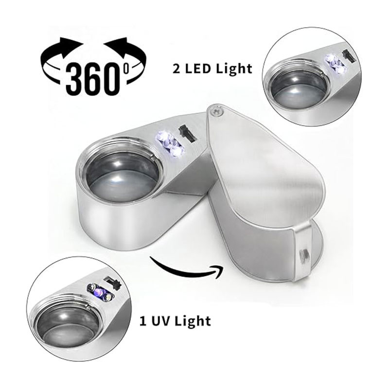 ذره بین تمام فلزی با بزرگنمایی 40 برابر/ با لامپ های کمکی ال ای دی / مناسب برای تشخیص جواهرات و اسکناس / نیاز به سه باتری LR