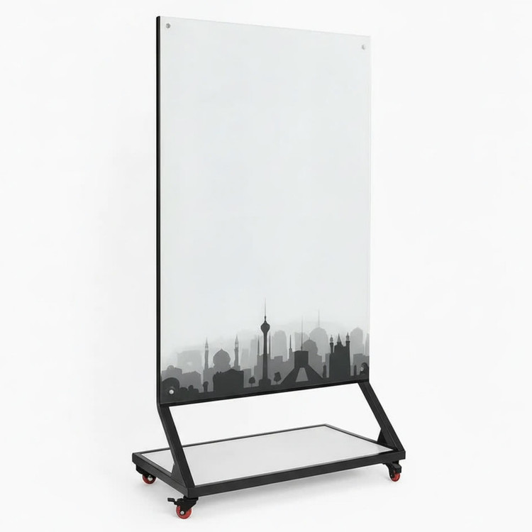تخته وایت برد شیشه ای پایهدار چرخدار با سطح سفید و پاکشوندگی آسان، مناسب استفاده آموزشی و اداری.دارای پایه فلزی مقاوم و ۴ چرخ روان با قابلیت جابجایی آسان. انتخابی کاربردی برای کلاسهای درس، دفاتر کار و اتاق جلسات.
