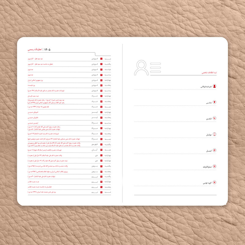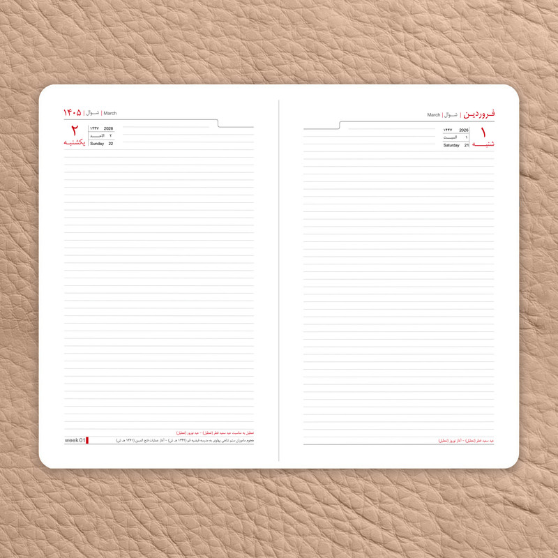 چیدمان صفحات داخلی بهصورت روزشمار طراحی شده است؛ هر روز در یک صفحه مستقل قرار دارد و تنها پنجشنبه و جمعهها به صورت مشترک در یک صفحه آمدهاند. این ساختار، فضای کافی برای یادداشتبرداری، ثبت جلسات و برنامهریزی دقیق روزانه فراهم میکند. تمامی مناسبتهای رسمی و ملی در صفحات درج شدهاند و تعطیلات با رنگ قرمز مشخص شدهاند تا در یک نگاه قابل تشخیص باشند.