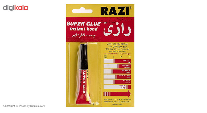 چسب قطرهای فوق یکی از محصولات تولیدی شرکت «رازی» (Razi) است. این محصول قدرت چسبندگی بالایی دارد و از آن میتوان برای چسباندن سطوح مختلفی مانند چوب، فلز، پلاستیک، شیشه، کاشی، سرامیک و چینی استفاده کرد. مواد بهکاررفته در این چسب قدرت چسبندگی بالایی دارند و ممکن است با برخی مواد واکنش دهند؛ ازاینرو بهتر است ابتدا مقداری از چسب را روی سطح موردنظر امتحان کنید و در صورتی که واکنشی مشاهده نکردید، از چسب استفاده کنید. شرکت رازی این چسب قطرهای را در حجمی کم (3 میلیلیتر) تولید کرده است. قدرت بالای چسبندگی و زمان خشکشدن مناسب این چسب قطرهای، آن را به محصولی بسیار کاربردی تبدیل کرده است. ساخار این چسب بهگونهای است که در مجاورت هوا خشک میشود. از دیگر مزایای این چسب قطرهای میتوان به شفافیت آن اشاره کرد که موجب تمیزترشدن کار پس از اتمام میشود. شرکت رازی این چسب را تحت عنوان مدل «Super Glue» به بازار عرضه میکند.