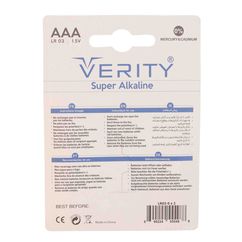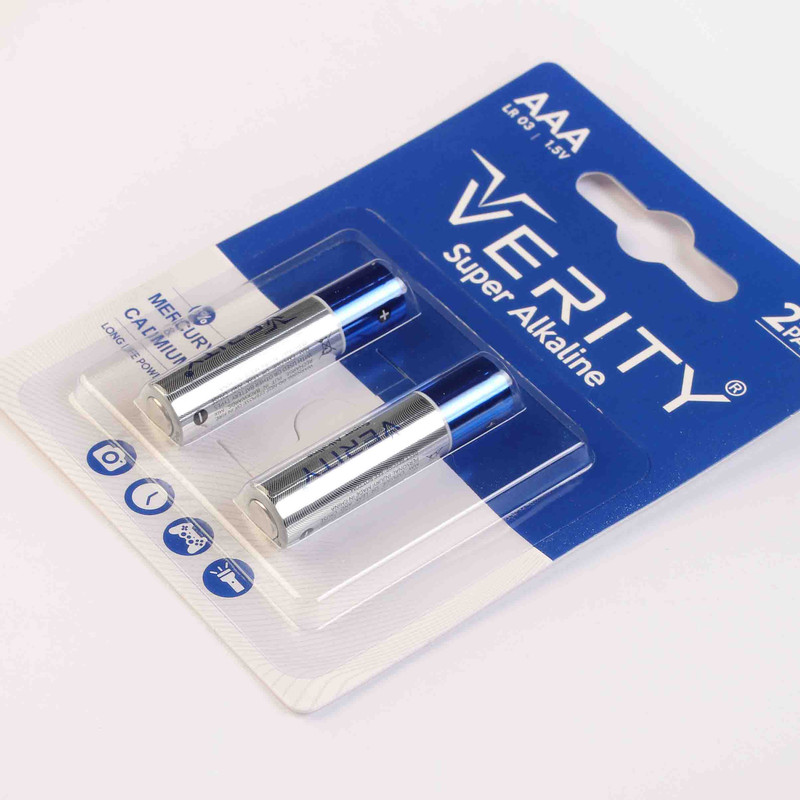 برند انگلیسی وریتی (ساخت چین ) باتری هایی با تکنولوژی سوپر آلکالاین تولید کرده که دارای عمری بالاتر نسبت به سری آلکالاین و اولترا آلکالاین میباشد . این باتری دوستدار محیط زیست ،بدون جیوه و کادمیوم میباشند . باتری های سوپر آلکالاین نیم قلمی وریتی مناسب کنترل ها - موس و دستگاه های پر مصرف میباشند...