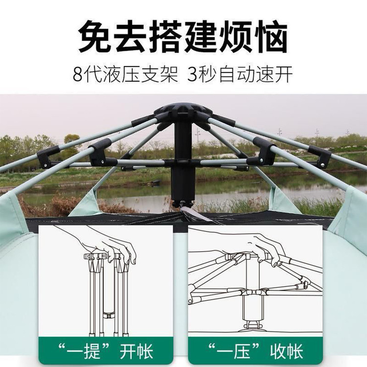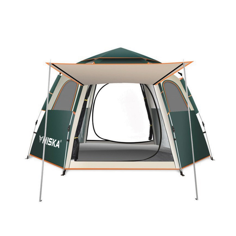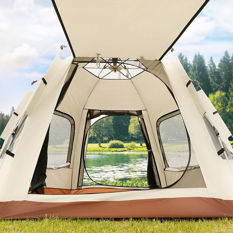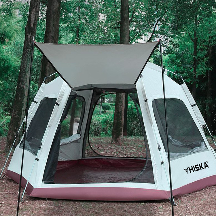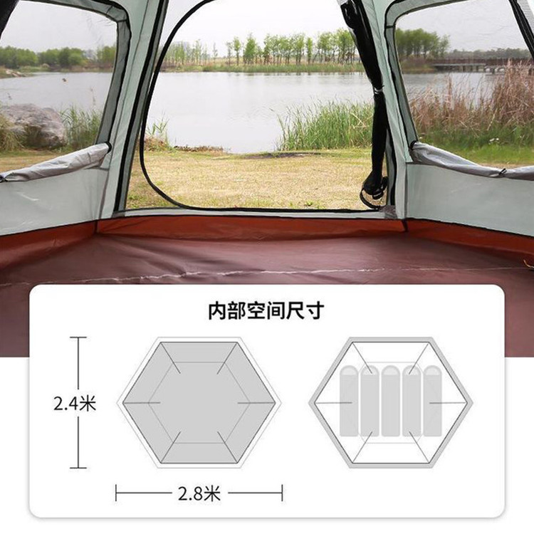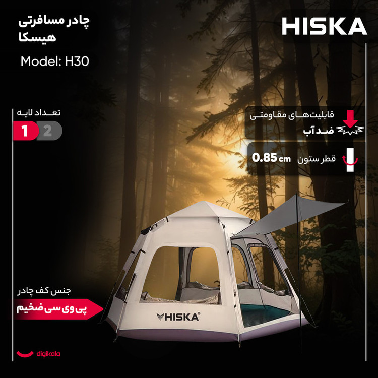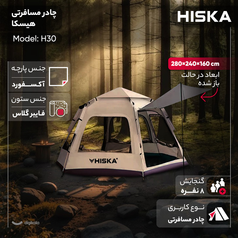 سایر توضیحات : کابین ضدآب، مقاوم در برابر باد و اشعه ماوراء بنفش - طراحی ششضلعی بزرگ با ظرفیت 8-5 نفر - جنس پارچه بیرونی: آکسفورد 210D با پوشش نقرهای - جنس پارچه داخلی: آکسفورد 210D با پوشش نقرهای - جنس میلهها: فایبرگلاس 8.5 میلیمتری با سیستم فنری خودکار