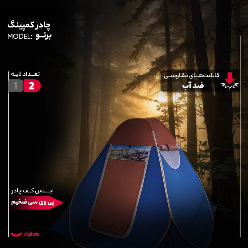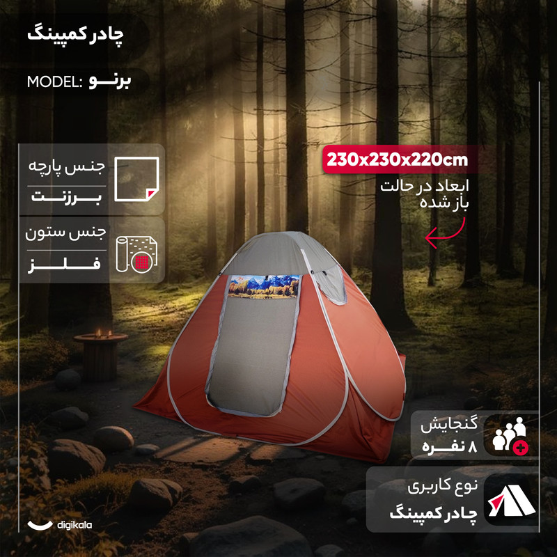 سایر توضیحات : این محصول دارای یک جیب داخل چادر ، یک بند آویز در قسمت سقف برای نگهداشتن لامپ می باشد . و توری کار شده در قسمت در و پنجره ها و هواکش ، توری حریر درجه یک می باشد. این محصول از جنس برنو است که این جنس ضد آب و مقاوم در برابر نورخورشید و باد است.