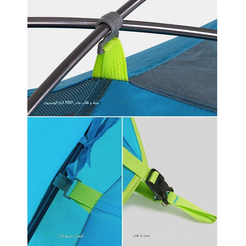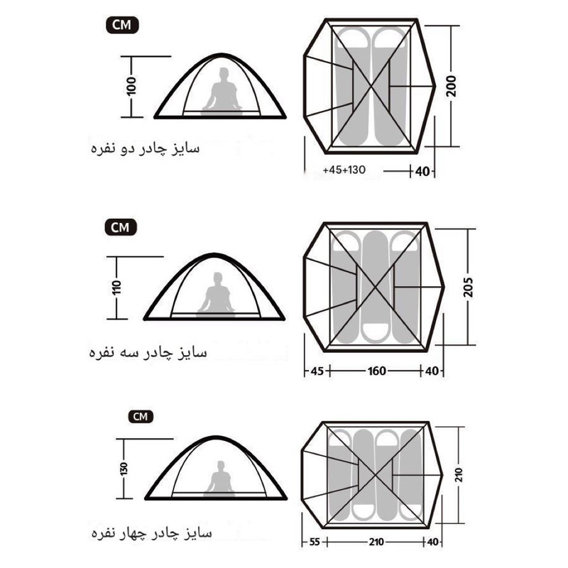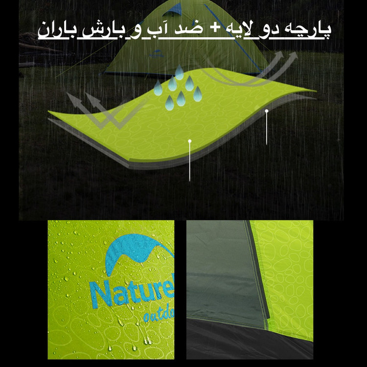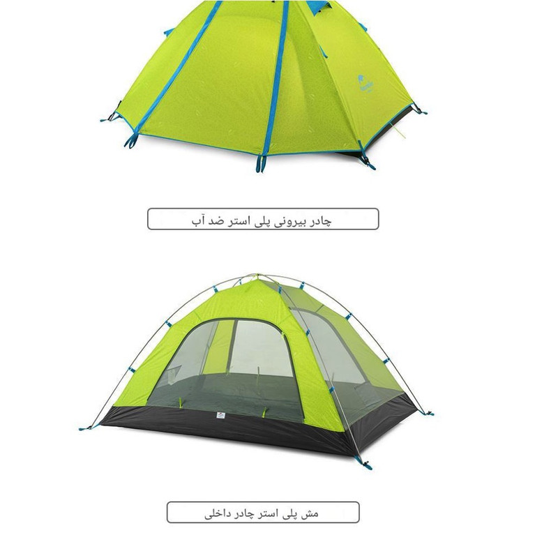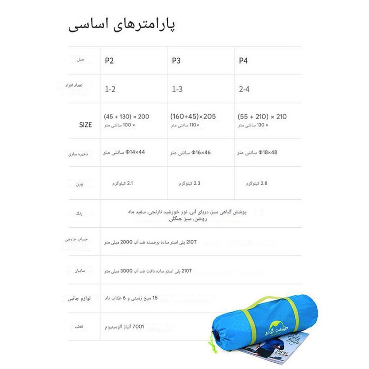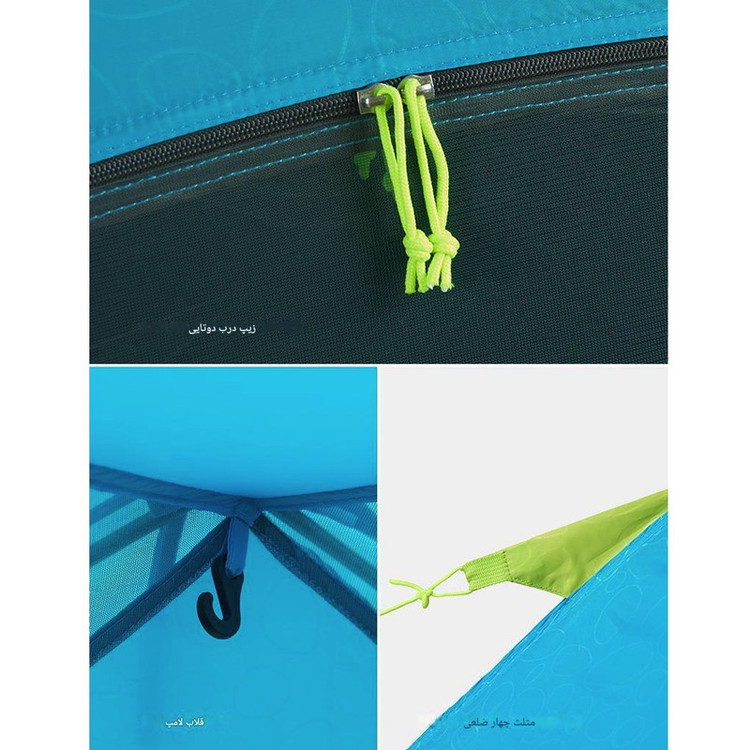 جنس پارچه کف چادر:پلی استر 210T با پوشش فایبر جنس پوشش دوم: پلی استر 210 با پوشش فایبر شاخص مقامت در برابر آب و باران: 3000 میلی متر