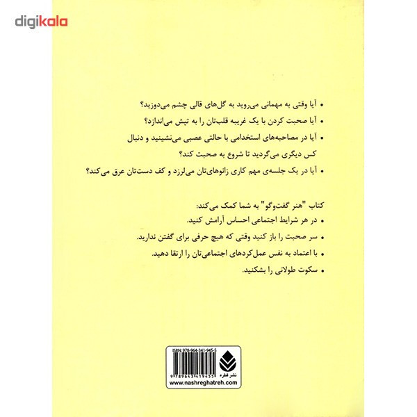 کتاب «هنر گفتوگو: چگونه بتوانیم در هر موقعیتی سر صحبت را باز کنیم» نوشتهی «دبرا فاین» را «مرجان مهدیپور» به فارسی برگردانده است. این کتاب راهبردها، توصیهها و مهارتهایی برای گفتوگو را در اختیارتان قرار میدهد. با خواندن این کتاب میتوانید: در هر شرایط اجتماعی احساس آرامش کنید؛ سر صحبت را باز کنید وقتی که هیچ حرفی برای گفتن ندارید؛ با اعتماد به نفس عملکردهای اجتماعیتان را ارتقا دهید و سکوت طولانی را بشکنید. در بخش آغاز کتاب آمده است: «اگر به محض شروع به صحبت حرفتان تمام میشود یا اگر از شرکت در گردهماییهای اجتماعی و کاری اکراه دارید به جای درستی مراجعه کردهاید. این کتاب به شما کمک میکند که مهارتهای لازم را به دست آورید تا در هر موقعیتی آرام و قرار داشته باشید. اگر بتوانید روشهایی را که در این جا شرح داده شده است عملی کنید هفتخوان گفتوگو را پشت سر میگذارید. با هر کسی گفتوگویی معنیدار را آغاز کنید. آتش مکالمهای را که در حال فروکش کردن است از نو روشن کنید. موضوع صحبت را تغییر دهید. در دایرهی دوستان، در مهمانیها یا وقت پذیرایی از دیگران، کاملا آسوده باشید. دوستیهای کاریتان را گسترش دهید. برای کنار کشیدن از گفتوگو با ظرافت عمل کنید.» کتاب حاضر را نشر «قطره» منتشر کرده است.