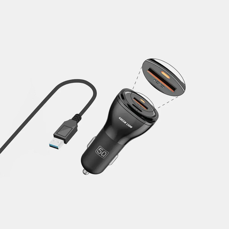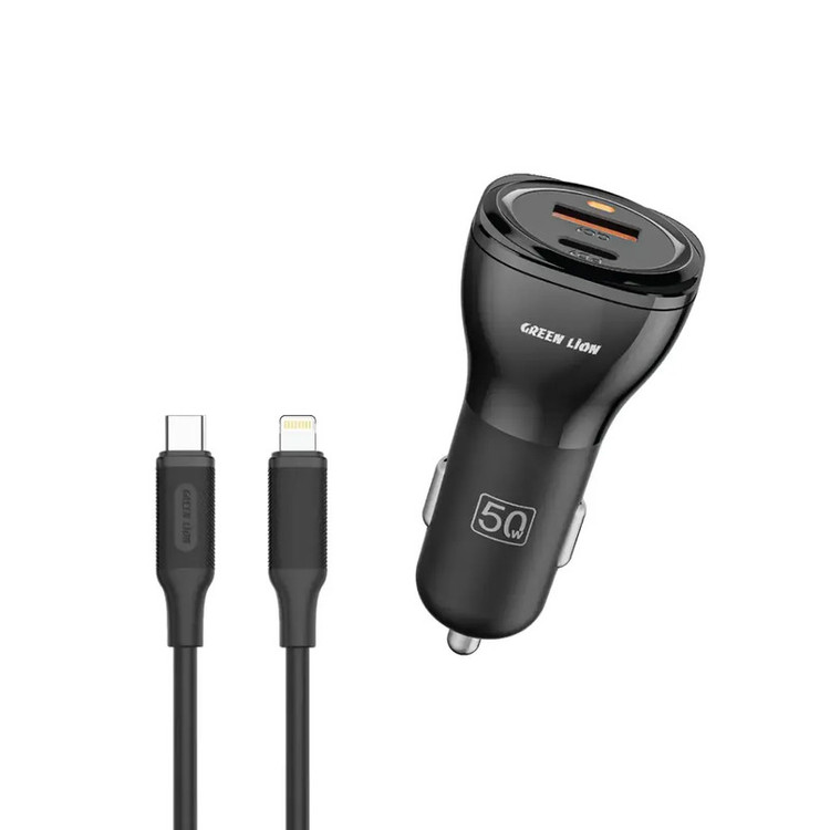 شارژر فندکی 30 وات 2 پورت گرین لاین مدل GNCC50WQPDBK به همراه کابل تبدیل USB-Cبه لایتنینگ