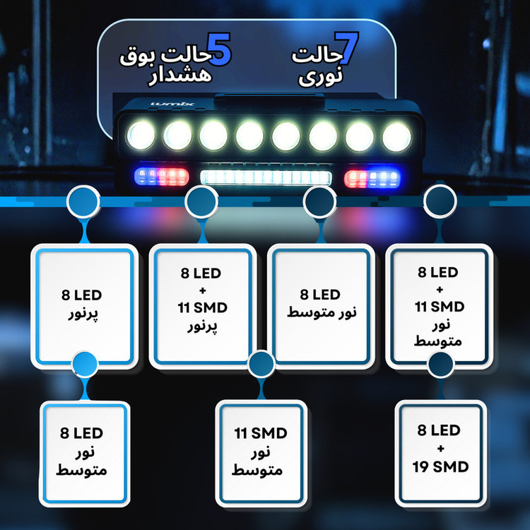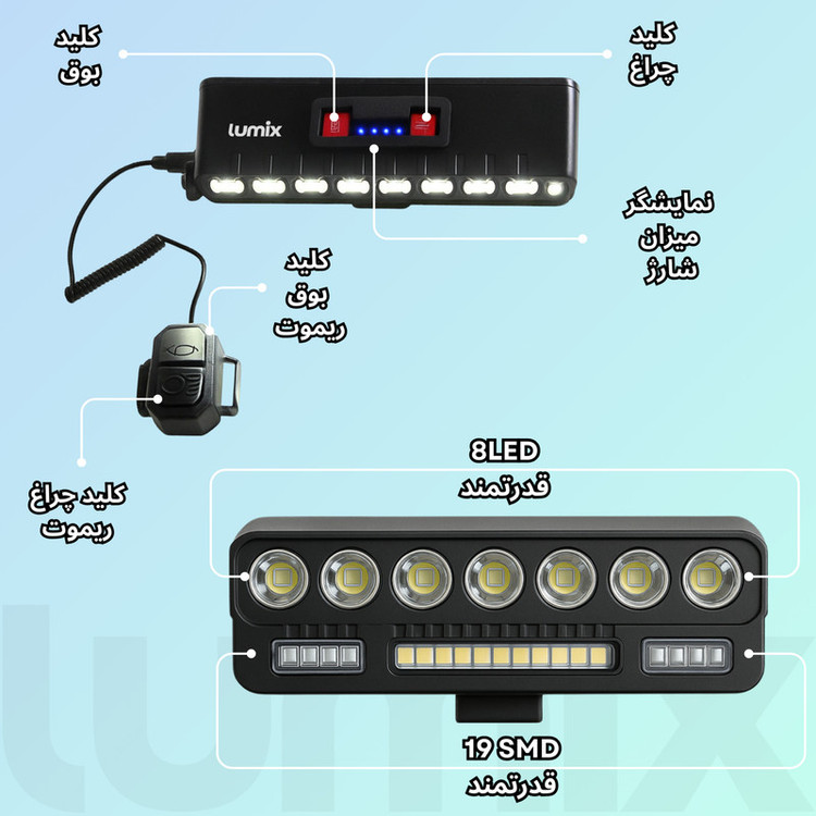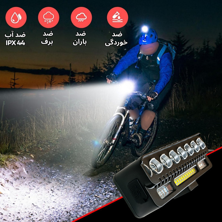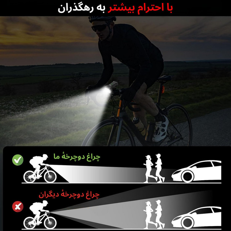 در ساخت این چراغ از ۸ عدد LED باکیفیت و ۱۹ چراغ SMD با کارایی مختلف استفاده شده که نوردهی بسیار قوی و یکنواختی و کاربردی ایجاد میکنند. شدت روشنایی 1500 لومن باعث میشود مسیر پیش رو، حتی در تاریکترین جادهها، مسیرهای بینشهری و راههای کوهستانی، بهطور کامل قابلمشاهده باشد و کوچکترین موانع بهراحتی تشخیص داده شوند. این ویژگی نقش مهمی در افزایش ایمنی و کاهش خطرات هنگام دوچرخهسواری شبانه دارد.