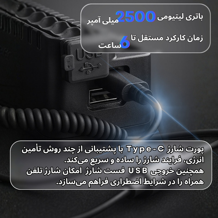 چراغ جلو Lumix LX-1500 به یک باتری داخلی 2500 میلیآمپرساعتی مجهز شده که از طریق شارژ سریع USB شارژ میشود و بسته به حالت نوردهی، بین 3 تا 6 ساعت کارکرد مداوم را فراهم میکند. یکی از قابلیتهای کاربردی این مدل، امکان استفاده بهعنوان پاوربانک است که به شما اجازه میدهد در مواقع ضروری، گوشی موبایل یا سایر دستگاههای الکترونیکی خود را شارژ کنید.