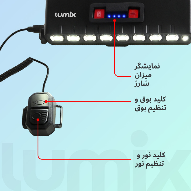 چراغ جلو Lumix LX-1500 به یک باتری داخلی 2500 میلیآمپرساعتی مجهز شده که از طریق شارژ سریع USB شارژ میشود و بسته به حالت نوردهی، بین 3 تا 6 ساعت کارکرد مداوم را فراهم میکند. یکی از قابلیتهای کاربردی این مدل، امکان استفاده بهعنوان پاوربانک است که به شما اجازه میدهد در مواقع ضروری، گوشی موبایل یا سایر دستگاههای الکترونیکی خود را شارژ کنید.