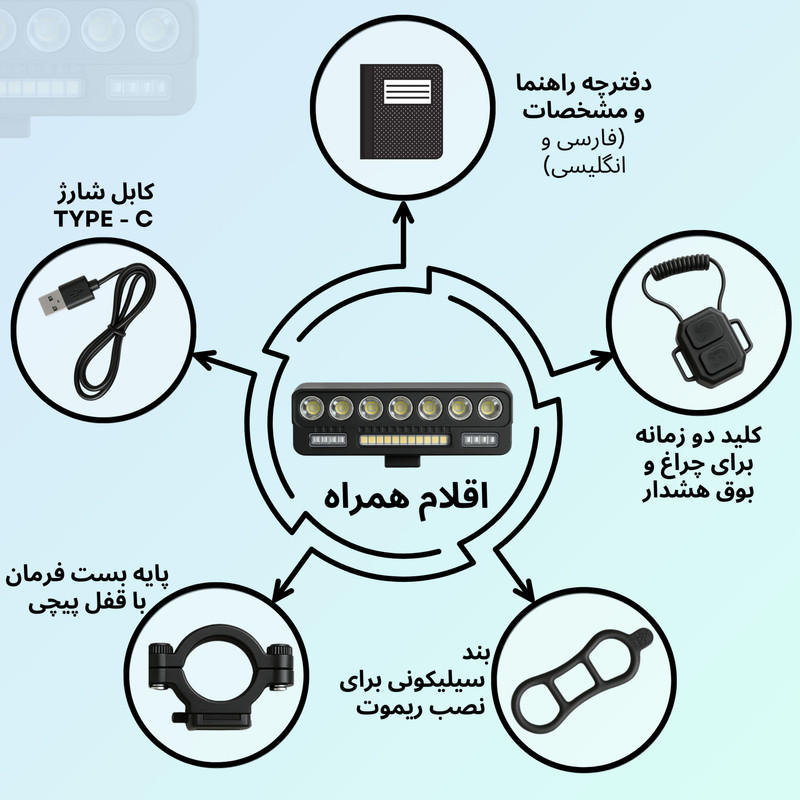کلید دو زمانه بوق و چراغ کابل تایپ C بند سیلیکونی نصب ریموت بست پیچی نصب روی فرمان دفترچه راهنما فارسی و انگلیسی