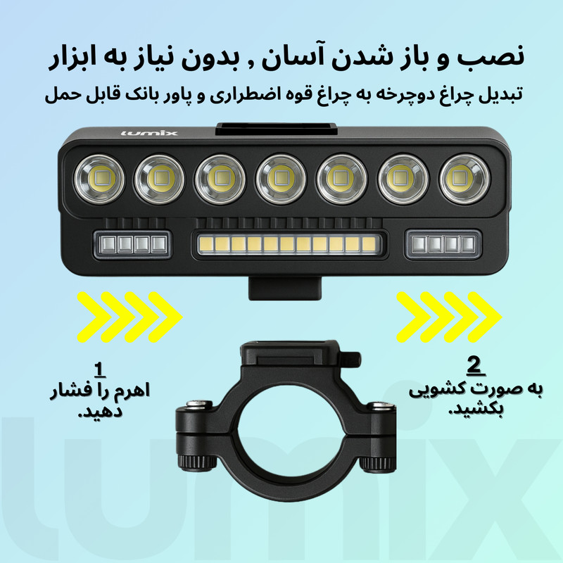 وزن سبک 150 گرم و طراحی جمعوجور این چراغ باعث میشود بدون ایجاد سنگینی روی فرمان نصب شود. نصب آن بسیار آسان است و با براکت همراه بهراحتی روی انواع دوچرخه ثابت میشود. چراغ جلو Lumix LX-1500 انتخابی مناسب برای دوچرخهسواری روزمره، سفر، طبیعتگردی، سواری شبانه و استفاده حرفهای است و میتواند همراهی مطمئن در تمام مسیرها باشد.
