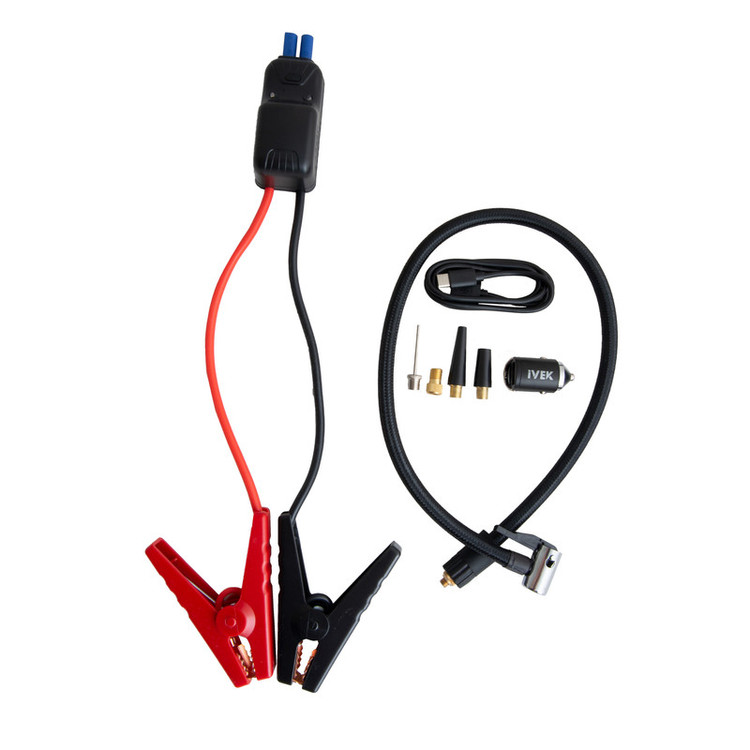 دارای سری شارژر فندکی مخصوص ماشین با خروجی USB و Type-C برای شارژکردن لپتاپ ها و سایر دستگاهها ، دارای چهار عدد متعلقات کمپرسور برای بادکردن وسایل مختلف ، به همراه سیم شارژر Type-C ، گیره متصل شونده به باتری خودرو ، شلنگ رابط کمپرسور