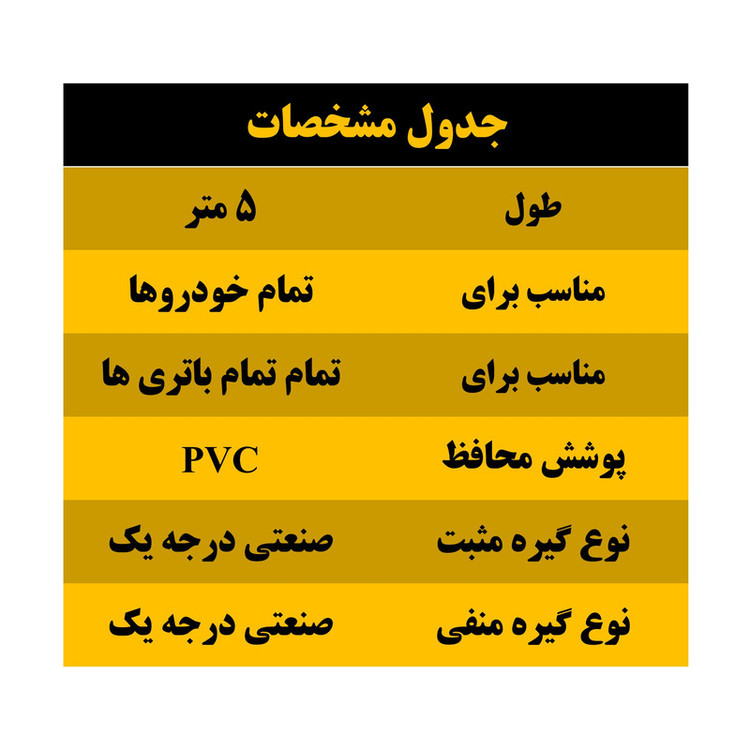 طول کابل ها 5 متر است. (امکان اختلاف طول کابل تا ۵ درصد طول وجود دارد) | دارای گیره های قوی و قدرتمند | پوشش محافظ پی وی سی PVC | رسانش بالا | طول مناسب | استفاده ساده | قابلیت استفاده برای تمام خودروها