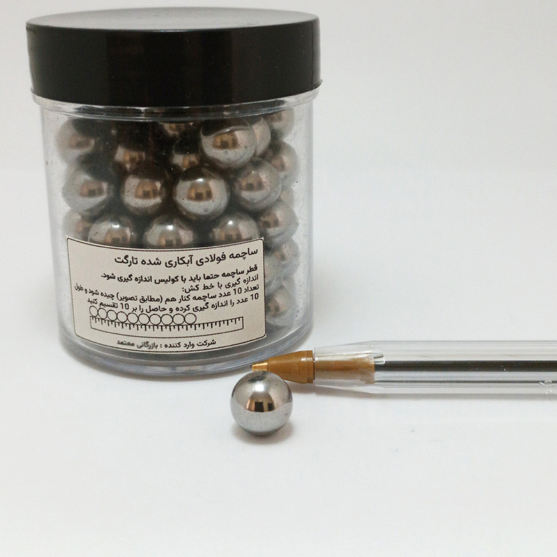 تعداد 80 عدد ساچمه کروی فلزی از جنس فولاد آبکاری شده به قطر 9 میلیمتر در بسته بندی کریستالی موجود می باشد.