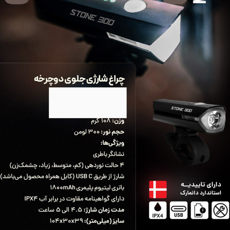 باطری ۱۸۰۰ mAh 4 حالت نور دهی کم , متوسط , زیاد و چشمک زن . دارای گواهینامه ی مقاومت در برابر آب IPX4 .