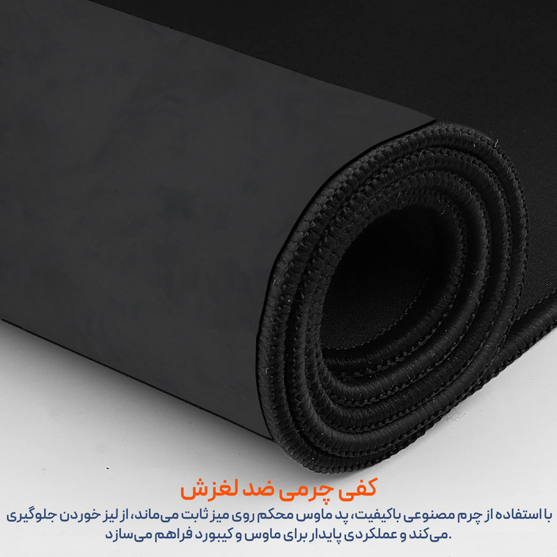 کفی پد از چرم مصنوعی هورس مقاوم و ضد لغزش است و پد را بدون هیچ حرکتی روی میز ثابت نگه میدارد. این ویژگی اهمیت ویژهای در هنگام انجام بازیهای سریع یا حرکات تند ماوس دارد و از جابهجایی ناخواسته جلوگیری میکند، به طوری که عملکردی پایدار و مطمئن در استفاده طولانیمدت ایجاد میشود. لبههای پد بهصورت دوخته طراحی شدهاند تا علاوه بر افزایش دوام، از خراشیده شدن دست جلوگیری کنند و راحتی استفاده حتی در ساعتهای طولانی را تضمین کنند.