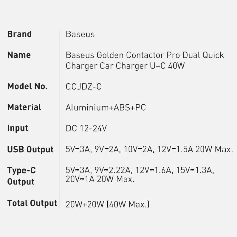 شارژر فندکی باسئوس مدل CCJDZ-C 40W
