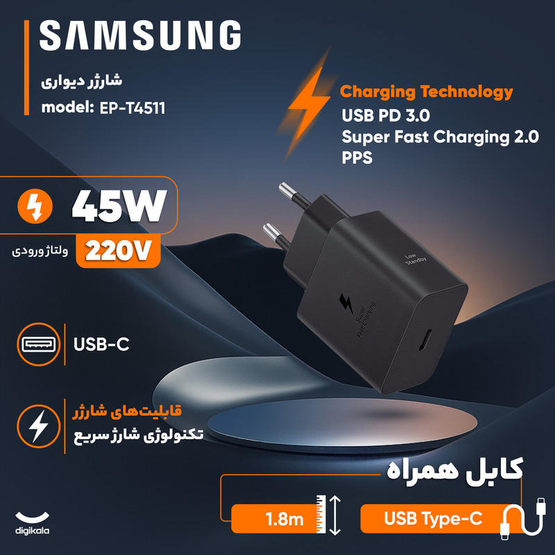شارژر دیواری 45 وات سامسونگ مدل EP-T4511 Low Standby به همراه کابل USB-C به طول 1.8 متر