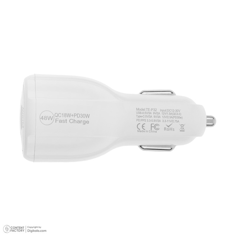 استفاده از شارژر استاندارد ضمن کوتاه کردن زمان شارژ گوشی از طریق حفظ پایداری شدت جریان باعث افزایش دوام باتری گوشی میشود. امروزه استفاده از روشهای کاهش دما و مدار کاهنده دامنه نوسان جریان الکتریکی متمایز کننده شارژرهای استاندارد و با کیفیت از محصولات متفرقه و ارزان سازی شده میباشد. شارژر فندکی مدل فست شارژ TE-P32 دارای دو خروجی USB-A و USB Type C است که پورت USB-A دارای توان 18W و پورت USB-C دارای توان خروجی 30W میباشد. این شارژر دارای مدار نوسان گیر و محافظ دما بوده و در حین انجام فرایند شارژ داغ نمیشود. در صورت استفاده از کابل شارژ استاندارد، این شارژر دارای قابلیت شارژ سریع (فست شارژ) است و به راحتی میتواند حس استفاده از شارژر اصلی گوشی را تداعی کند. بدنه این شارژر از جنس پلیمر ABS شفاف بوده و در دو رنگ سفید و مشکی به بازار عرضه شده است.