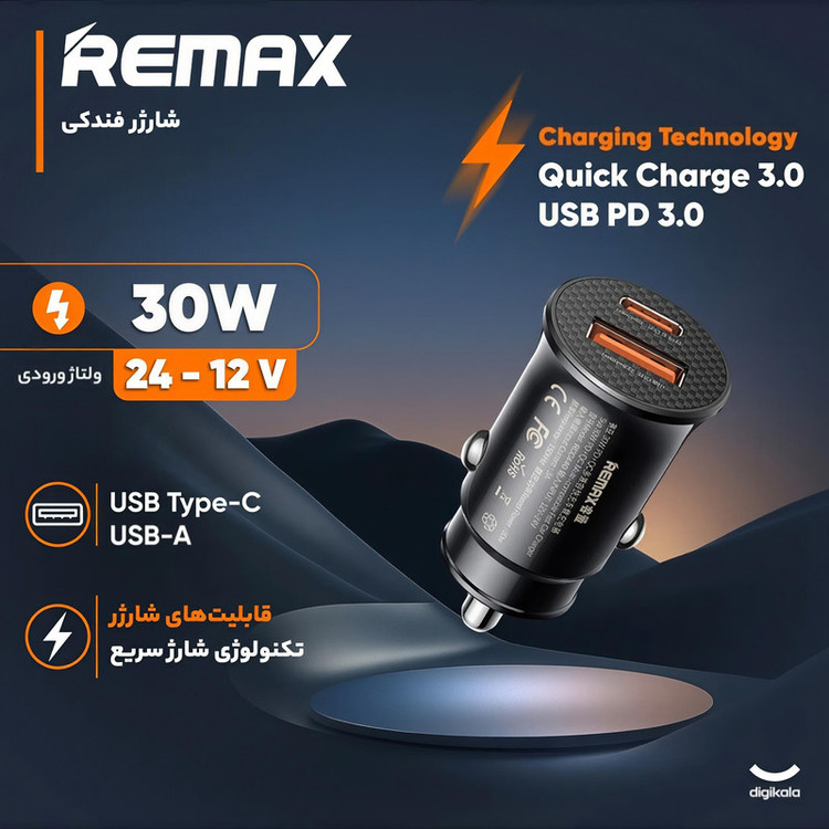 شارژر فندکی 30 وات دو پورت ریمکس مدل RCC358
