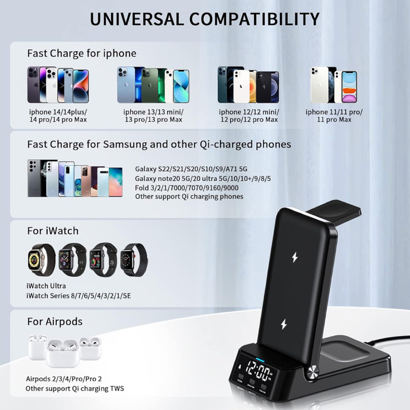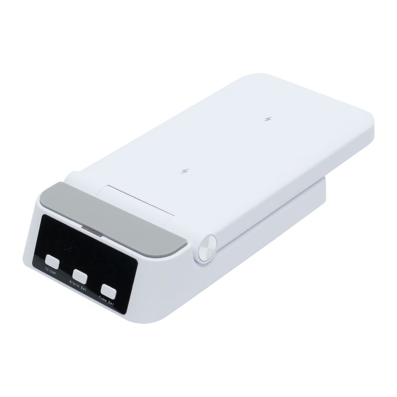 داک شارژ بصورت ایستاده و تخت قابل استفاده بوده، ساعت در دوحالت 24 و 12 ساعته قابل تنظیم است. ورودی دستگاه 9 ولت 3 آمپر و یا 12 ولت 2.5 آمپر با کابل تایپ C و خروجی شارژ بی سیم 15 وات (ایرپاد 5 وات و ساعت 1 تا 3 وات)، دستگاه دارای استاندارد CEو Rohs می باشد. دقت داشته باشید، آداپتور ورودی باید 9 ولت 3 آمپر و یا 12 ولت 3.5 آمپر باشد و با آداپتور 5 ولت، عملکرد دستگاه مطلوب نخواهد بود.