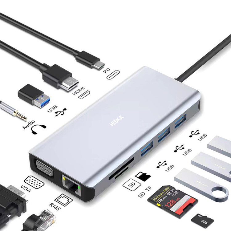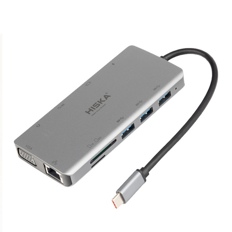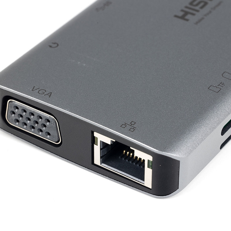 هاب 11 کاره - بدنه آلومینیوم تراش خورده یک عدد پورت HDMI 2.0 - یک عدد پورت VGA- یک عدد پورت شبکه LAN RJ45 - ورودی مموری کارتهای SD و TF یک عدد پورت PD 100W - چهار عدد پورت USB 3.0 - یک عدد پورت AUX 3.5mm