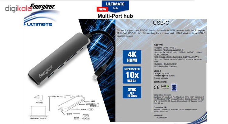این هاب مدل «ULTIMATE» از برند «انرجایزر» (Energizer) است که بهوسیله آن میتوانید دو درگاه USB 3.0 را به دستگاه خود اضافه کنید این ویژگی سبب میشود امکان اتصال دستگاههای بیشتری به سیستم خود را داشته باشید. به کمک USB 3.0 میتوانید در کوتاهترین زمان ممکن دستگاههای خود را شارژ کنید و نگرانی در این مورد نداشته باشید. از ویژگیهای مهم هاب ULTIMATE این است که سرعت انتقال اطلاعات در آن به 5 گیگابیت بر ثانیه میرسد. این هاب دارای کابلی با کانکتور USB-C است که به بدنه آن متصل شده است. این هاب از Plug and Play پشتیبانی میکند. با کمک این ویژگی دستگاه شما پس از اولین اتصال به رایانه به صورت خودکار و بدون انجام تنظیمات توسط شما آماده استفاده میباشد. این محصول دارای یک کاکتور USB-C است. علاوهبراین، کانکتور HDMI هم دیگر کانکتوری است که در این محصول وجود دارد. این هاب دارای یک کابل است که با طول 16 سانتیمتر به کامپیوتر یا لپتاپ متصل میشود. گفتنی است این هاب امکان خوانش کارتهای حافظه SD و microSD را هم داراست.