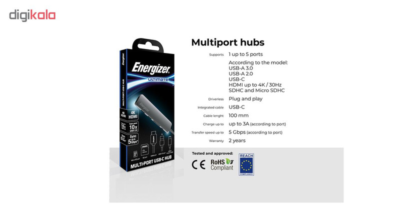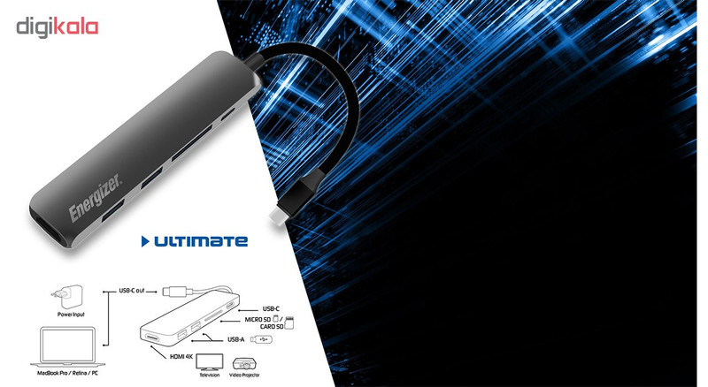 این هاب مدل «ULTIMATE» از برند «انرجایزر» (Energizer) است که بهوسیله آن میتوانید دو درگاه USB 3.0 را به دستگاه خود اضافه کنید این ویژگی سبب میشود امکان اتصال دستگاههای بیشتری به سیستم خود را داشته باشید. به کمک USB 3.0 میتوانید در کوتاهترین زمان ممکن دستگاههای خود را شارژ کنید و نگرانی در این مورد نداشته باشید. از ویژگیهای مهم هاب ULTIMATE این است که سرعت انتقال اطلاعات در آن به 5 گیگابیت بر ثانیه میرسد. این هاب دارای کابلی با کانکتور USB-C است که به بدنه آن متصل شده است. این هاب از Plug and Play پشتیبانی میکند. با کمک این ویژگی دستگاه شما پس از اولین اتصال به رایانه به صورت خودکار و بدون انجام تنظیمات توسط شما آماده استفاده میباشد. این محصول دارای یک کاکتور USB-C است. علاوهبراین، کانکتور HDMI هم دیگر کانکتوری است که در این محصول وجود دارد. این هاب دارای یک کابل است که با طول 16 سانتیمتر به کامپیوتر یا لپتاپ متصل میشود. گفتنی است این هاب امکان خوانش کارتهای حافظه SD و microSD را هم داراست.