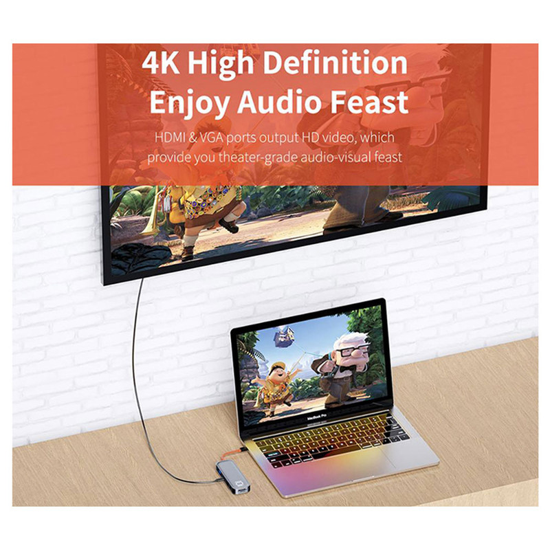 دارای 10 پورت، 2 پورت USB3.0، یک پورت USB2.0، یک پورت Type-C، یک پورت HDMI، یک پورت VGA ، یک پورت LAN، یک شیار SD، یک شیار TF و پورت AUX، انتقال داده سریع 5Gbps، فست شارژ PD 100W، پشتیبانی از تصاویر 4Kx2K، مناسب دستگاههای دارای پورت Type-C 3.1