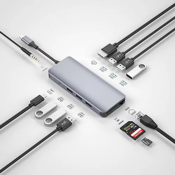 این هاب از جنس آلومینیوم بسیار با کیفیت طراحی شده است و دارای 12 پورت مختلف می باشد که با استفاده از یک پورت USB Type-C به کامپیوتر یا لپ تاپ شما متصل می شود.