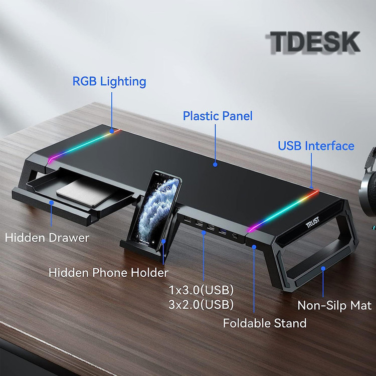 - هاب USB 4 Ports - دارای یک پورت ورودی USB 3.0 - دارای یک پورت خروجی USB 3.0 - دارای سه پورت خروجی USB 2.0 - نوار LED RGB روی دو طرف TDESK - کلید On / Off و تنظیم 10 حالت نور دهی - قابلیت تنظیم ارتفاع و طول