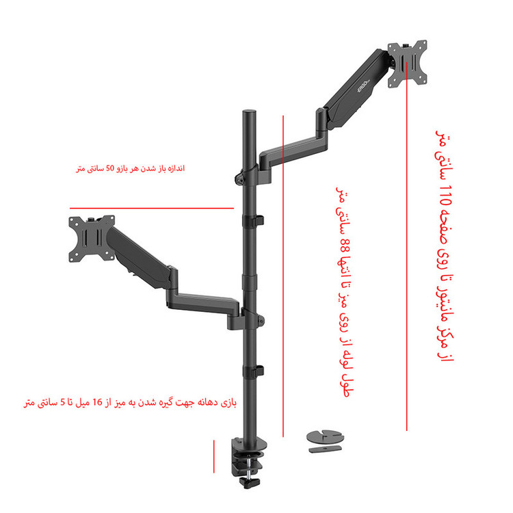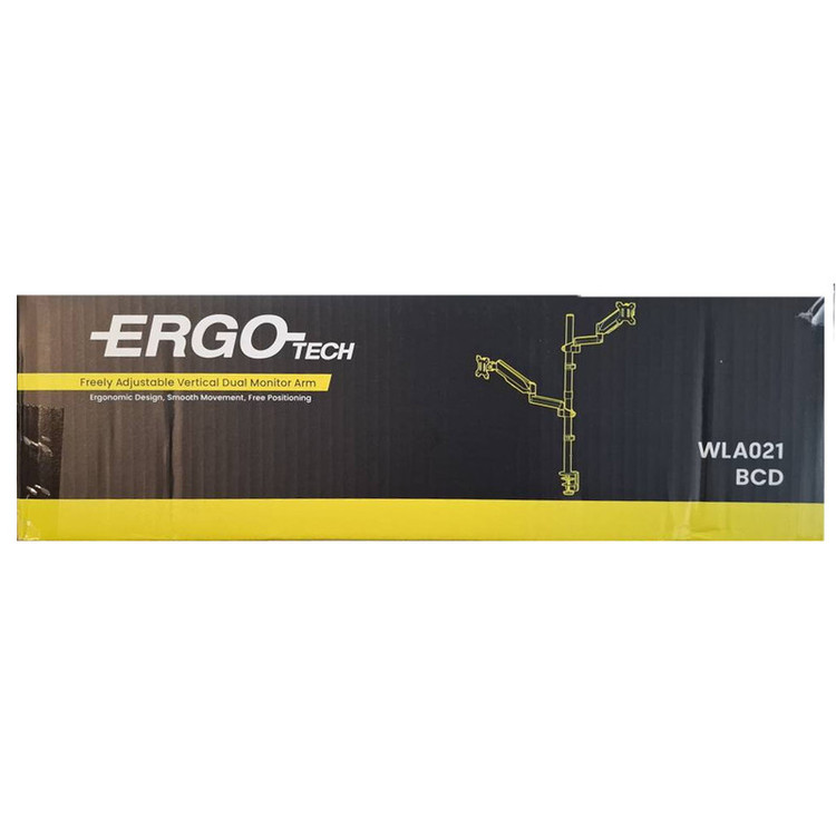 پایه مانیتور ERGO WLA021-BCD دارای مفصل متحرک با زاویه چرخش ۳۶۰ درجه برای بازوهای دارای جک گازی است همچنین دارای محفظه عبور کابل جهت نظم دهی بیشتر به محیط میباشد . قابلیت تنظیم ارتفاع دستی بازوها بر روی محور اصلی به وسیله پیچ آلن . مناسب 17 تا 32 اینچ