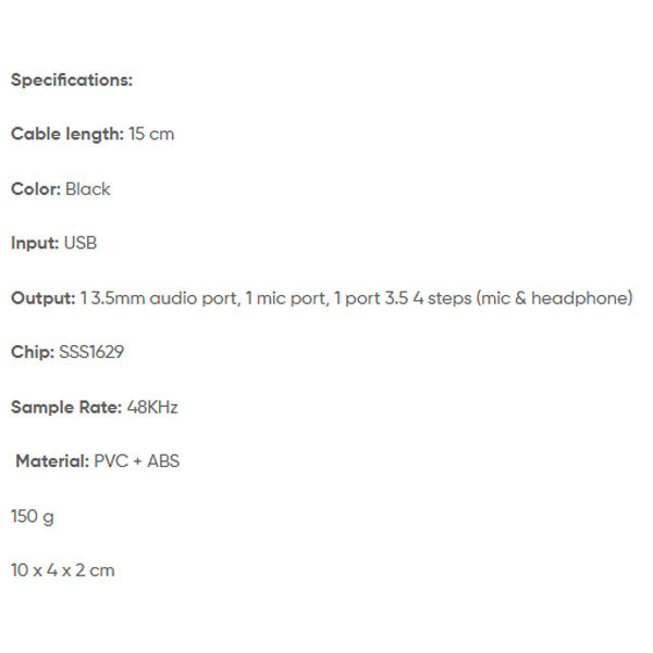 مشخصات فنی: دارای یک درگاه USB2.0 برای اتصال به کامپیوتری دارای 2 جک 3.5 میلیمتری صدا برای اتصال اسپیکر و میکروفن قابل استفاده برای PS Pro / Slim