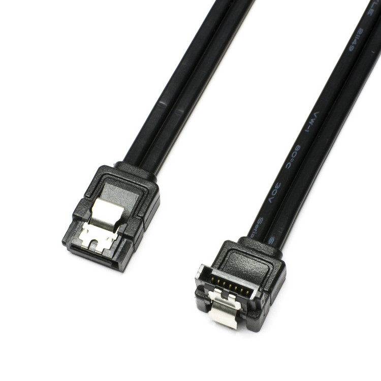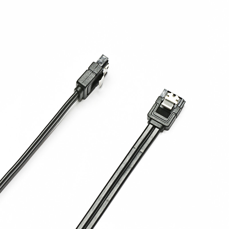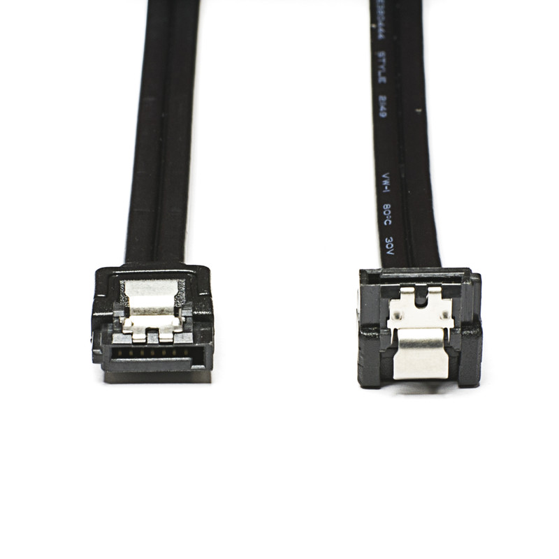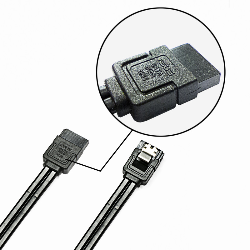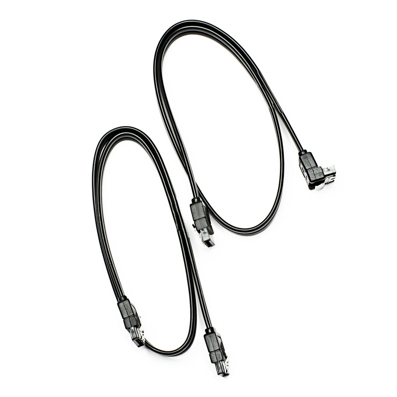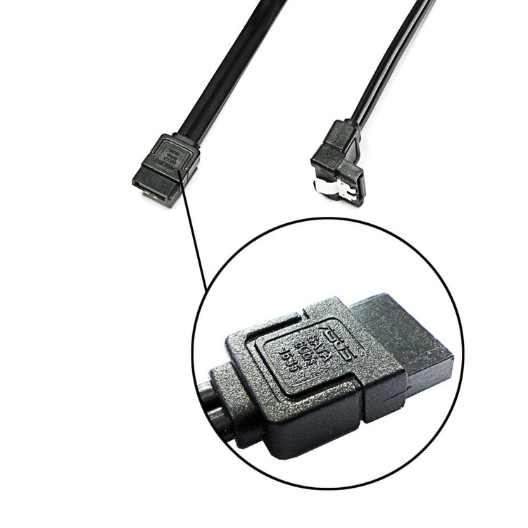 بسته بندی شامل دو کابل میباشد : یک کابل با دو سری صاف و دیگری با یک سری صاف و یک سری 90 درجه دارای ضامن قفل شونده به پورت SATA پهنای باند شش گیگابیت بر ثانیهی مناسب برای SSD