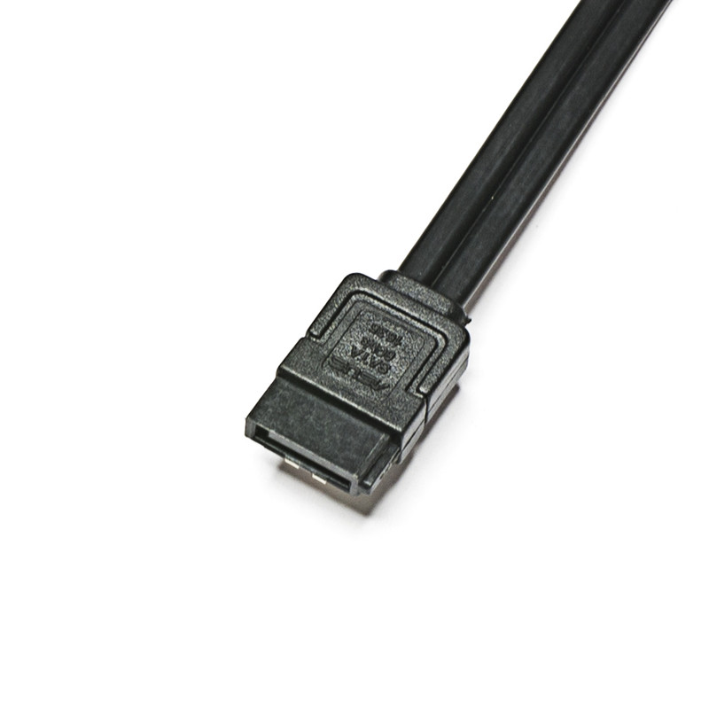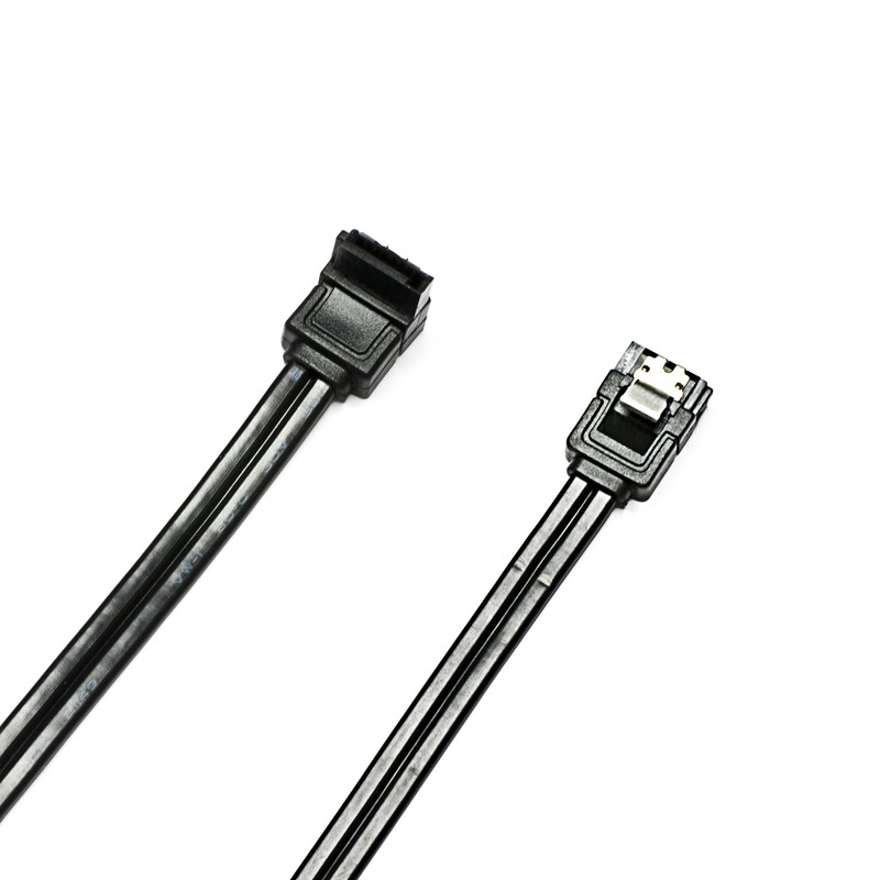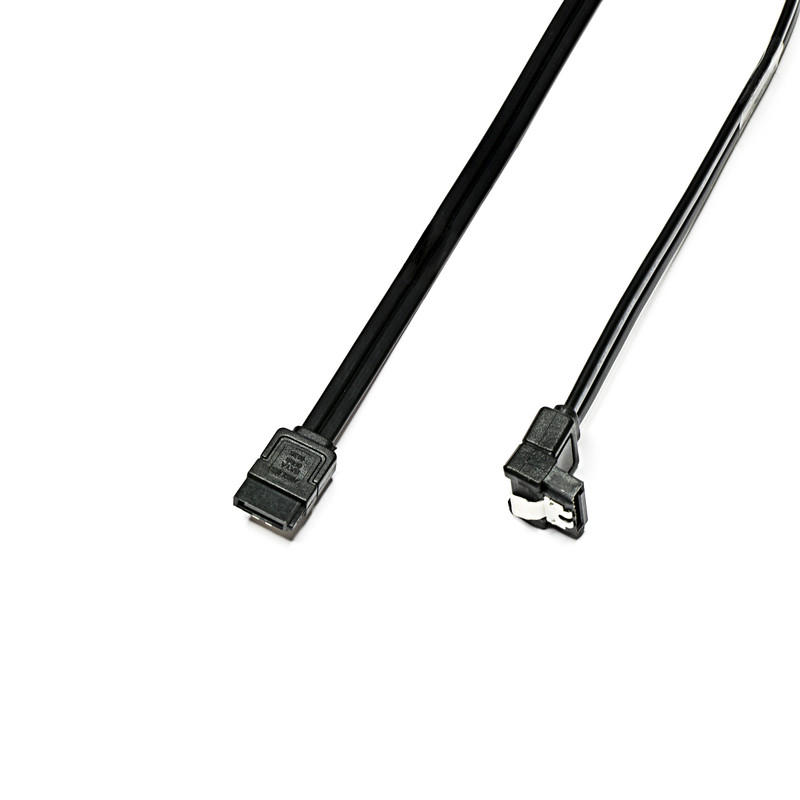 بسته بندی شامل دو کابل میباشد : یک کابل با دو سری صاف و دیگری با یک سری صاف و یک سری 90 درجه دارای ضامن قفل شونده به پورت SATA پهنای باند شش گیگابیت بر ثانیهی مناسب برای SSD