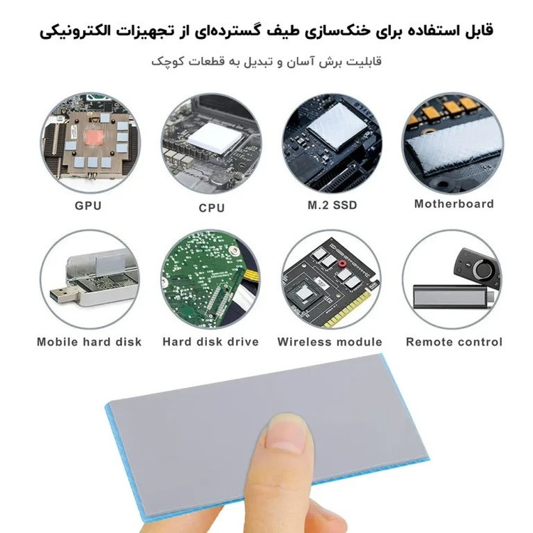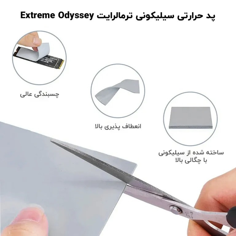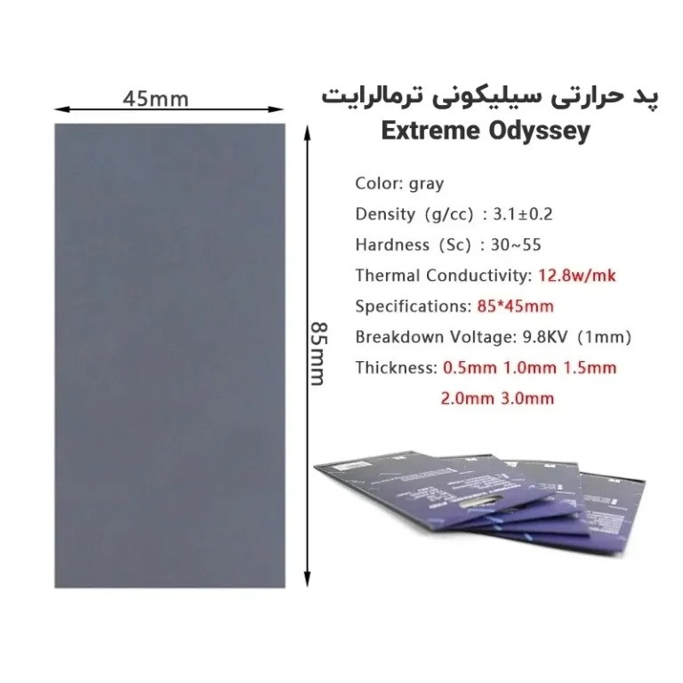 جنس: سیلیکونی | رسانایی گرمایی: 12.8 W/mK | چگالی: 3.1±0.2 g/cc | ولتاژ شکست: 9.8 kV | سختی: حدود 30–55 | عایق الکتریکی: غیررسانا برقی