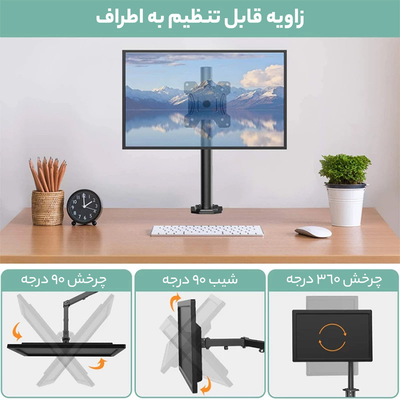 متریال ساخته شده این پایه مانیتور خارجی از آلیاژ آلومینیم هواپیمایی پایداری و تعادل بالا به واسطهی استفاده از مفاصل و ستون مستحکم آن میتوان از نقاط قوت این پایه اشاره کرد.روی این پایه رومیزی هولدر هایی تعبیه شده است که میتوانید مدیریت کابلهای مانیتور را انجام دهید.