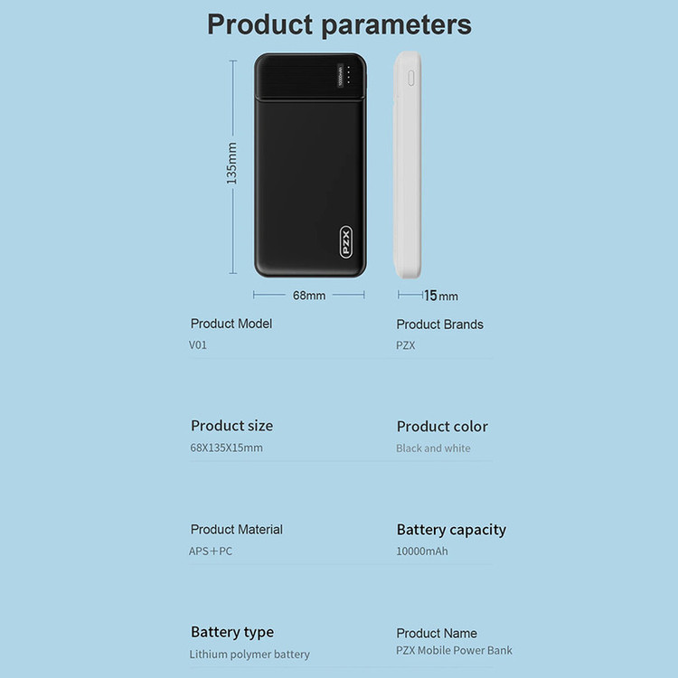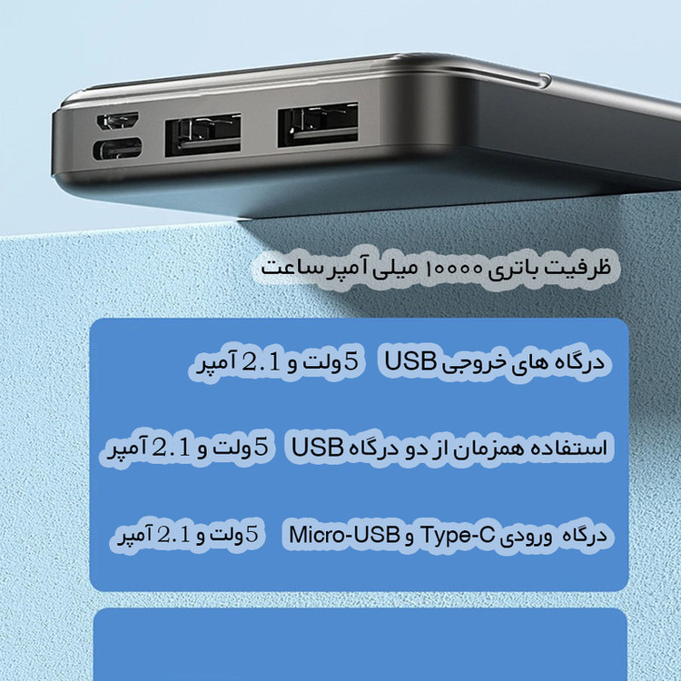 مشخصات فنی: برند معتبر pzx - ظرفیت اسمی ده هزار میلی آمپر ساعت - بسیار سبک و خوشدست - دارای دو درگاه USB - یک درگاه Type-C - یک درگاه Micro USB