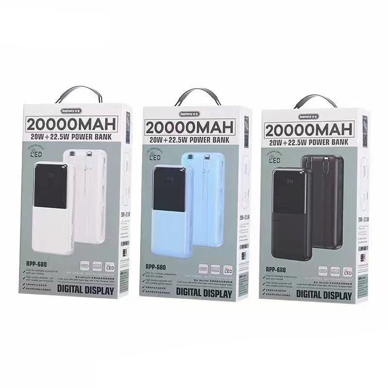 ظرفیت ۲۰۰۰۰ میلی آمپر دارای صفحه نمایش دارای دو عدد کابل سرخود برای تایپ سی و لایتنینگ قابلیت فست شارژ خروجی ۲۲.۵ وات ۰ ۲۰ وات دارای سه عدد خروجی و یک عدد ورودی