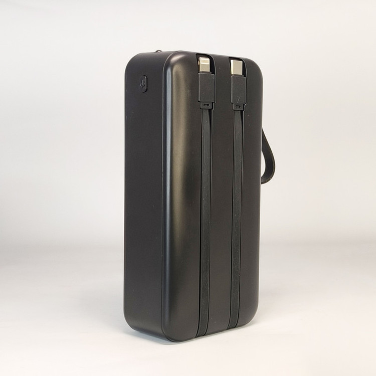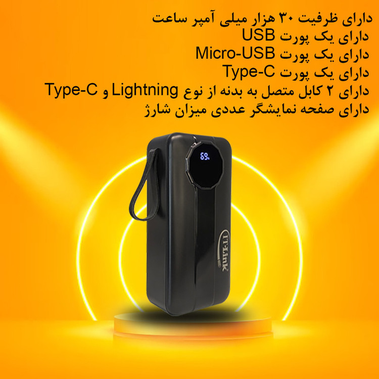 دارای ظرفیت 30 هزار میلی آمپر ساعت / دارای یک پورت USB / دارای یک پورت Micro-USB / دارای یک پورت Type-C / دارای 2 کابل متصل به بدنه از نوع Lightning و Type-C / دارای صفحه نمایشگر عددی میزان شارژ