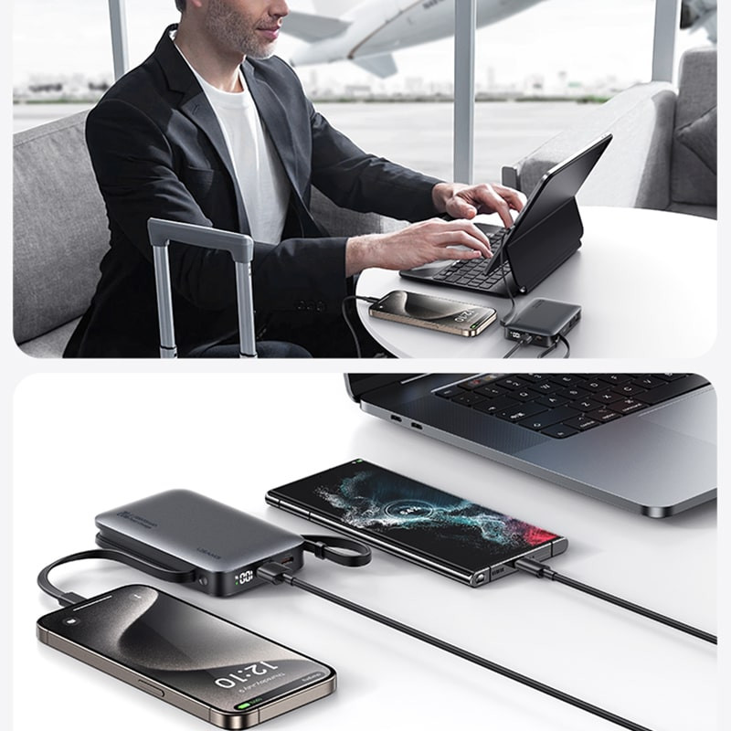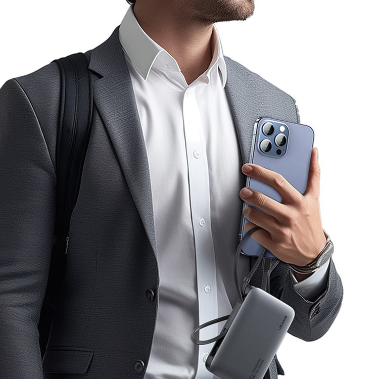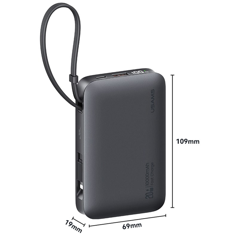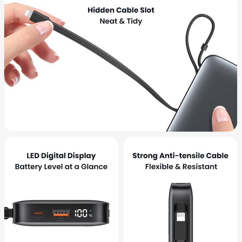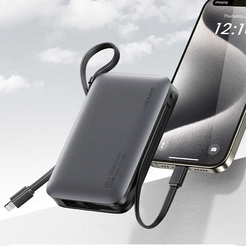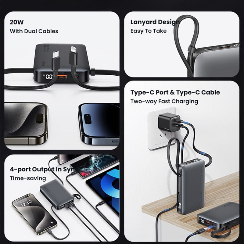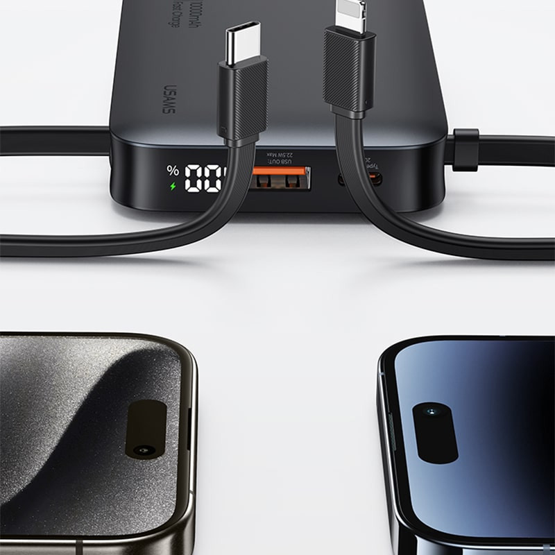 یوسمز برای این مدل دو پورت USB-A و USB-C در نظر گرفته و علاوه بر آن، یک کابل Type-C و یک کابل لایتنینگ متصل به بدنه تعبیه کرده است. نتیجه این طراحی هوشمندانه این است که میتوانید همزمان تا 4 دستگاه را بدون نیاز به حمل کابل اضافی شارژ کنید.