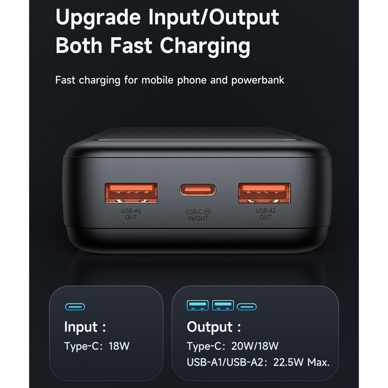USB A1/A2 output : 4.5V⎓5A,5V⎓4.5A,5V⎓3A,9V⎓2A,12V⎓1.5A,22.5W Max. USB-C : 5V⎓3A,9V⎓2.22A,12V⎓1.67A,20W Max.