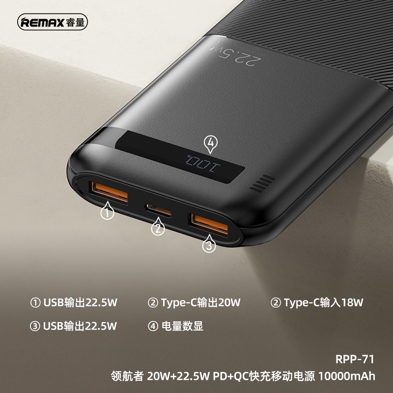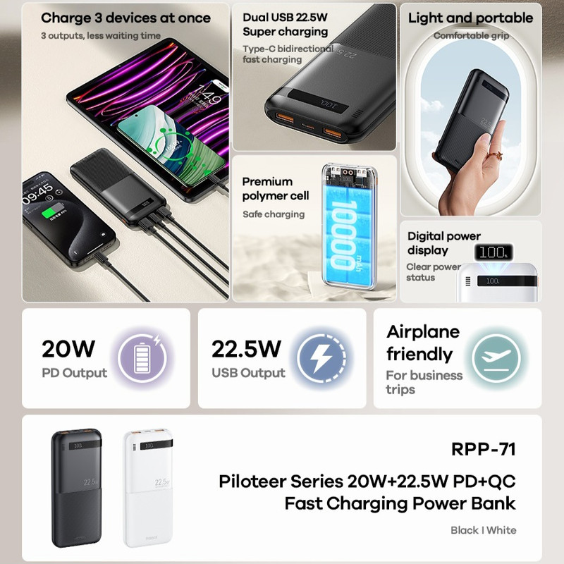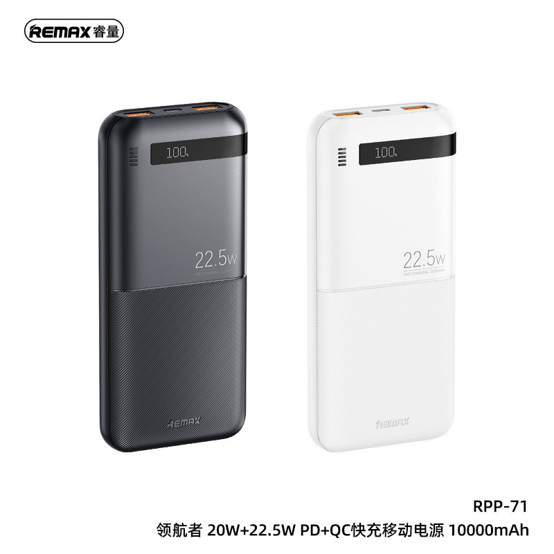 پاور بانک ریمکس RPP-71 با ظرفیت 10000 میلی آمپر ساعت یک دستگاه کاربردی برای شارژ همراه است. این پاور بانک با امکان شارژ سریع دوگانه 20 وات و 22.5 وات، انتقال انرژی کارآمدی ارائه می دهد که زمان شارژ دستگاه ها را کاهش می دهد.