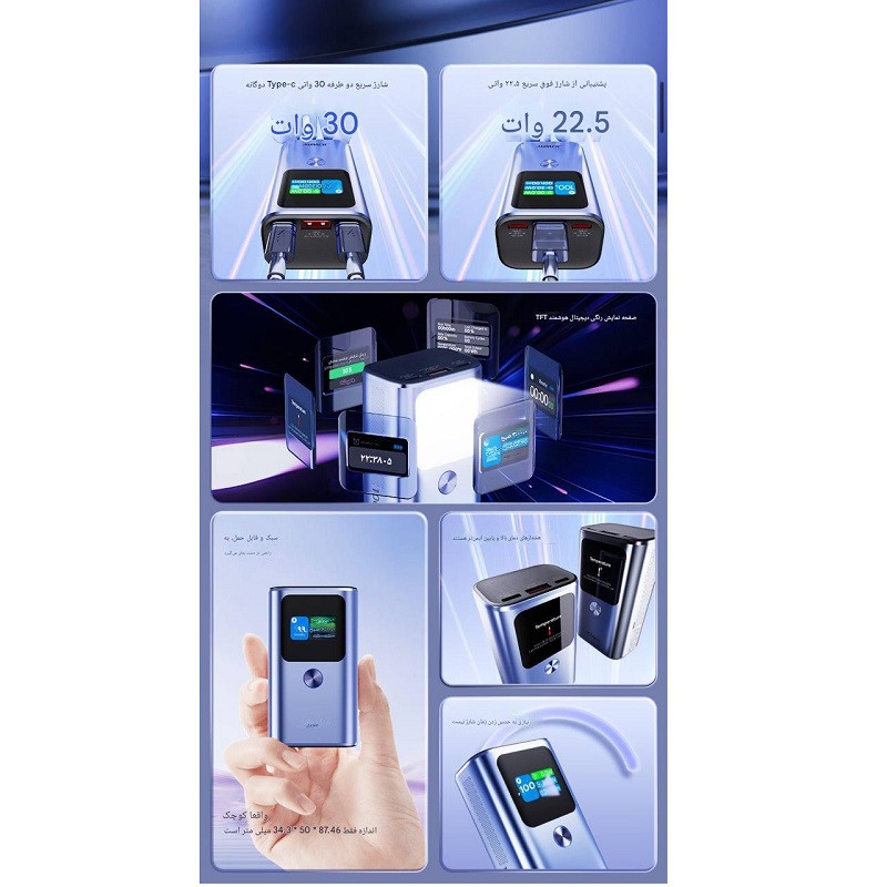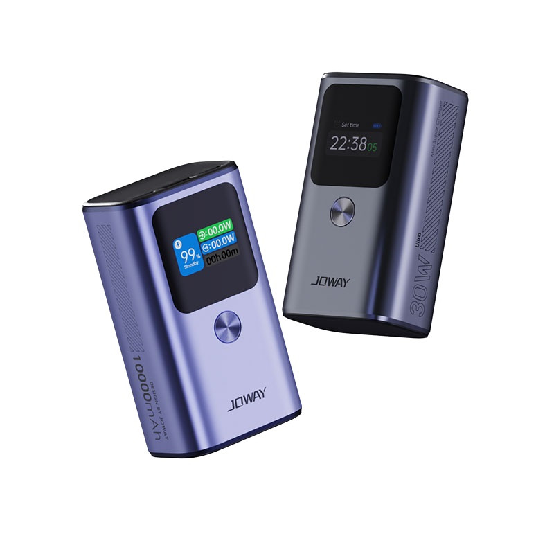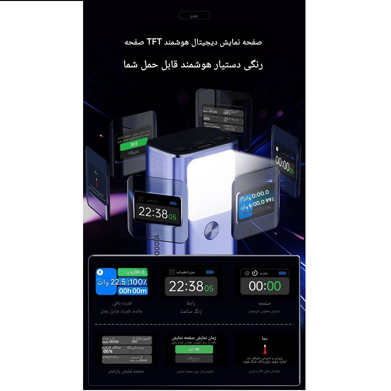 نمایشگر بزرگ TFT رنگی روی دستگاه، اطلاعات کاملی مانند درصد شارژ، ساعت، دما و وضعیت عملکرد پاوربانک را نمایش میدهد. این نمایشگر همچنین قابلیت تنظیم ساعت، آلارم و استفاده به عنوان کرنومتر را دارد. یکی دیگر از ویژگیهای خاص این مدل، دماسنج داخلی برای نمایش دمای محیط است.